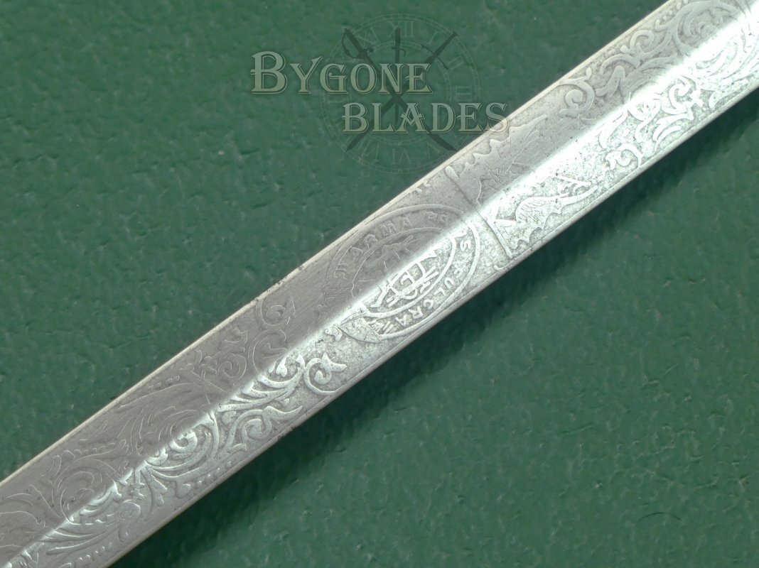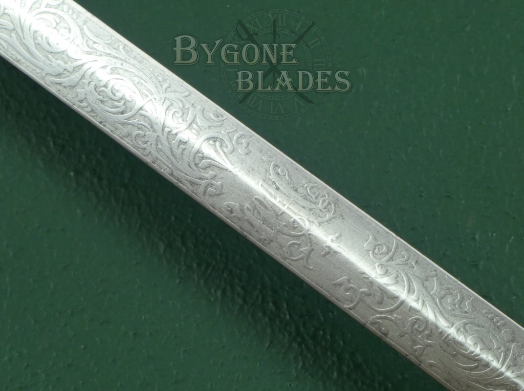 The blade is etched with foliate scrollwork within trefoil arches and the crest of the Honourable Artillery Company, an armoured arm between wings bearing the cross of St. George and holding a mace. Below the crest is the oval badge of the HAC showing the motto: “Arma Pacis Fulcra” (Armed strength for peace).