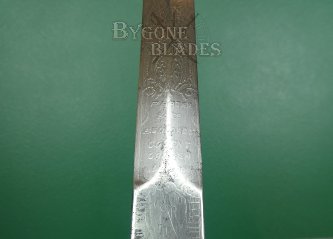 The obverse of the blade is etched with arches and foliate scrollwork above and below the calligraphed initials, HAC. The forte bears the cutler’s details, Prater & Co., Bedford St., Covent Garden, London. The blade etchings are worn.