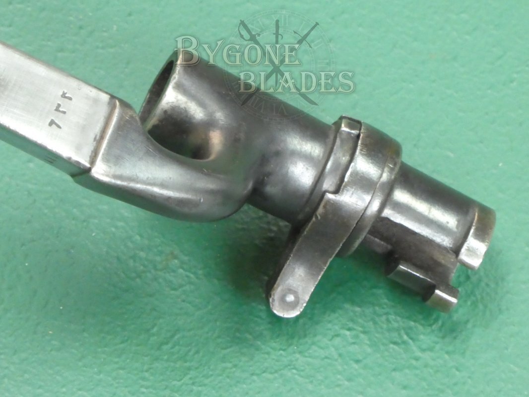 The 542mm tri-form blade is in excellent condition, retaining its original polish. The base of the blade is stamped with the War Department “WD” stamp, Broad Arrow and Enfield factory inspection stamp above a worn production date. An inverted Broad Arrows stamp indicates that the bayonet was sold out of military service. The additional stamps are Egyptian.