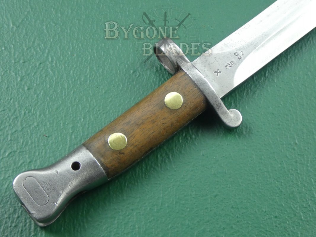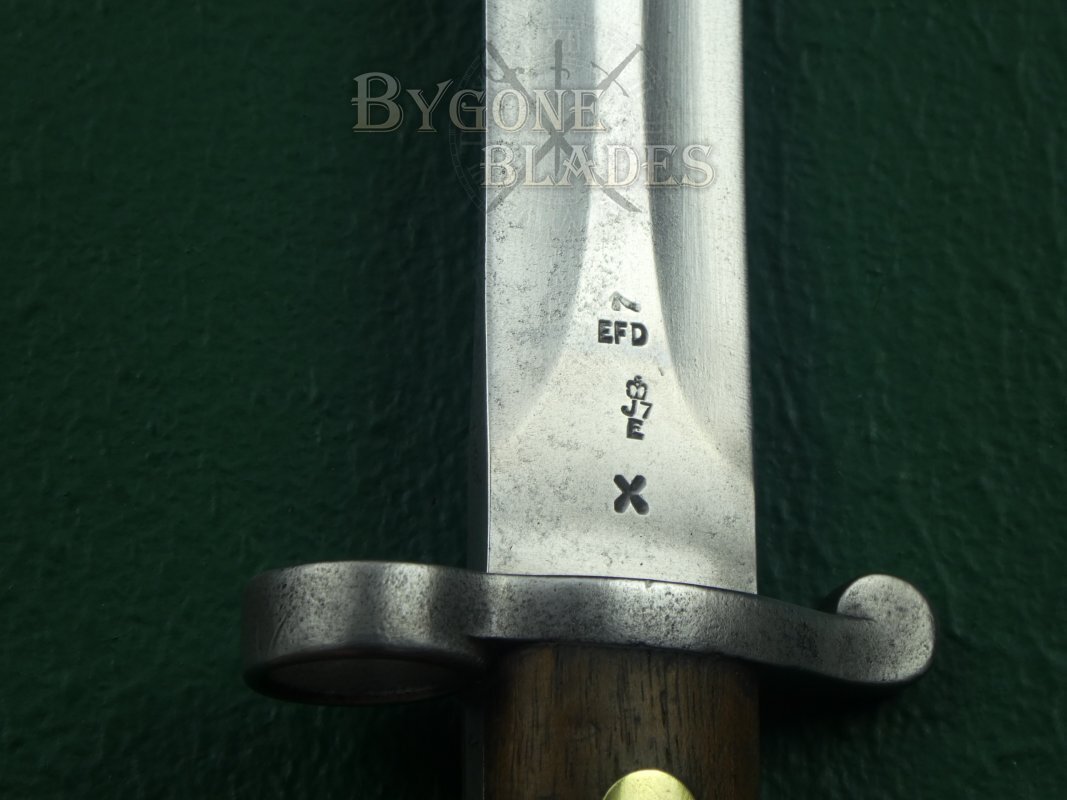 The obverse ricasso is marked with EFD below the War Department arrow, an Enfield inspection mark and a bend test stamp. The blade spine also bears an Enfield inspection stamp. The blade was service sharpened and is in good condition with minor use related marks and some very shallow pitting and tarnish on one side (it can hardly be felt when running one’s finger along the blade surface).