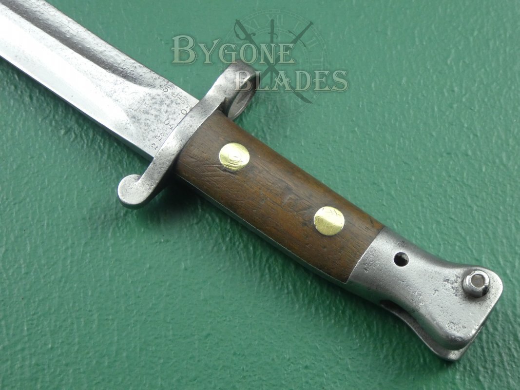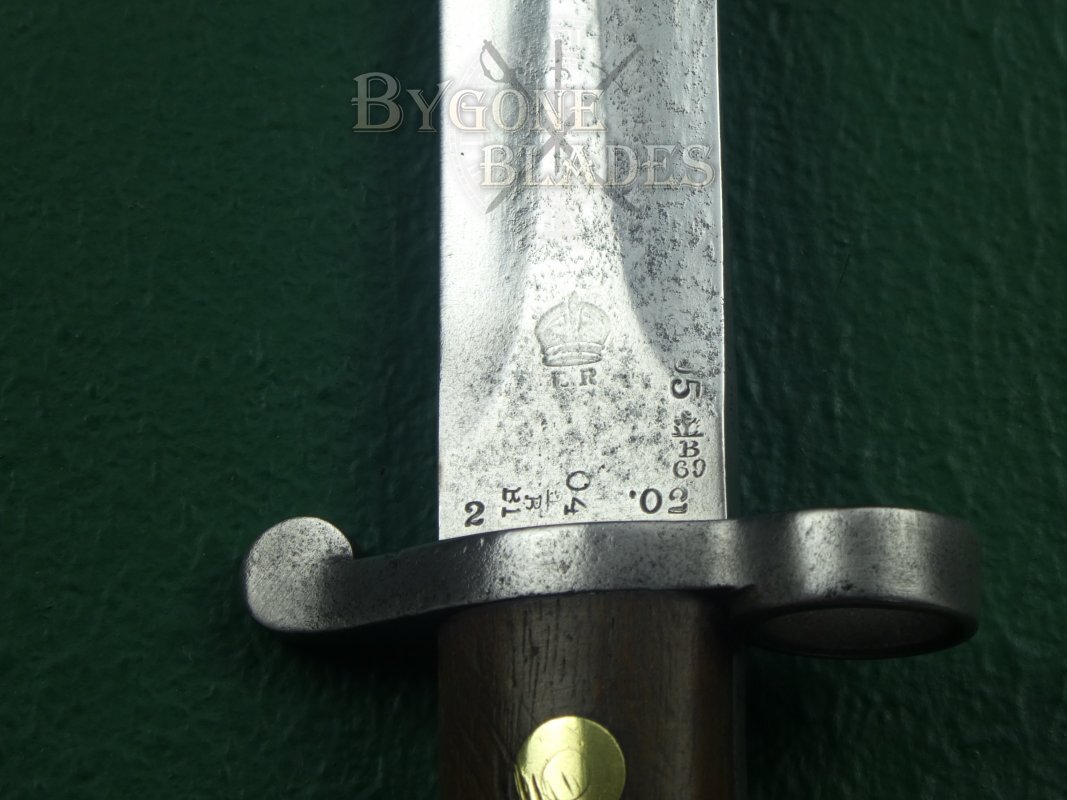 This desirable bayonet is in good condition for its 119 years of age and is highly collectable. The 301mm double-edged blade is nicely marked on the ricasso with a flat crown above ER (Edward VII) and the production date, 2 ‘02 (February, 1902). Additional reissue dates of 1904 and 1905 with accompanying Birmingham inspection marks are also stamped on the ricasso.