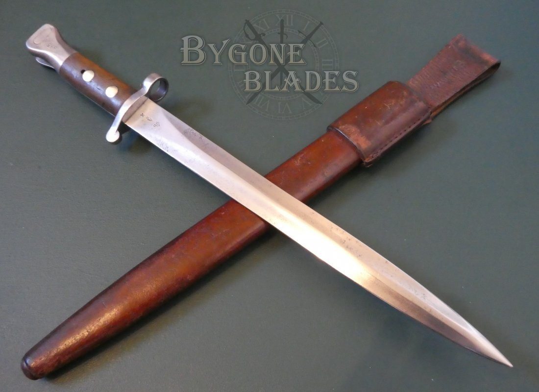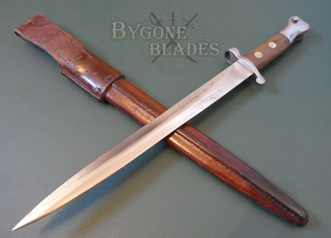 British Pattern 1888 Mk I Type II Lee Metford Rifle Bayonet issued to the Royal Navy. P1888 Lee Metford bayonets are highly collectable. Naval issue examples in a 1903 Mk III pattern naval issue scabbard are rare.