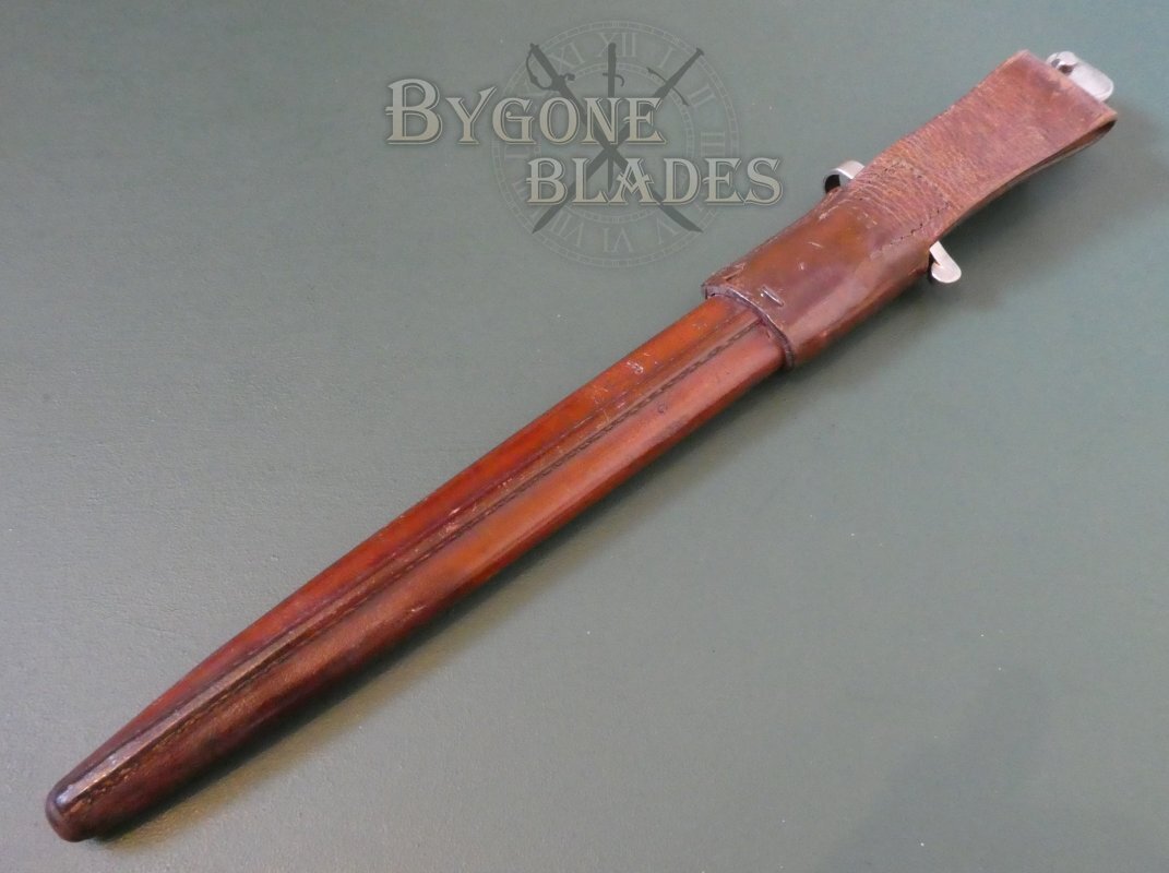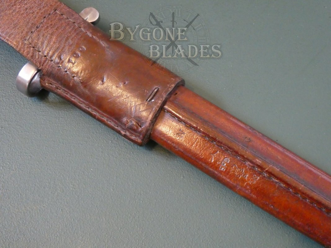 The bayonet is complete with its 1903 Mk III pattern naval issue brown leather scabbard with integral frog and internal steel locket and chape. The leather is in great condition and retains its original finish with age appropriate wear and marks. The stitching is intact and firm and the leather is stamped with the navy N, a broad arrow, Enfield EFD, the date ’06 (1906) and a crowned Enfield inspection mark. A capital letter G is stamped on the opposite side of the seam.