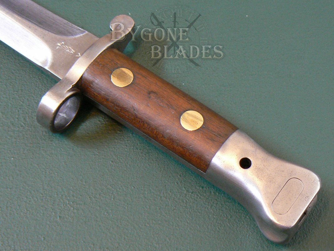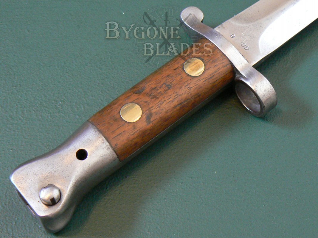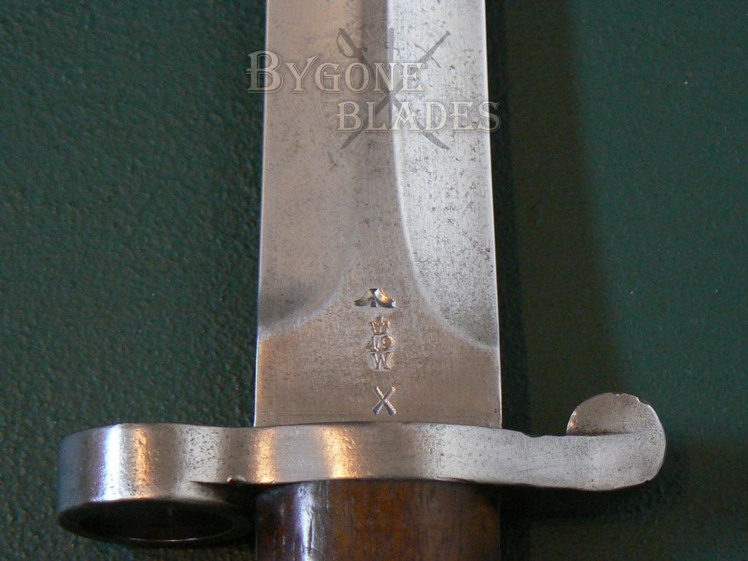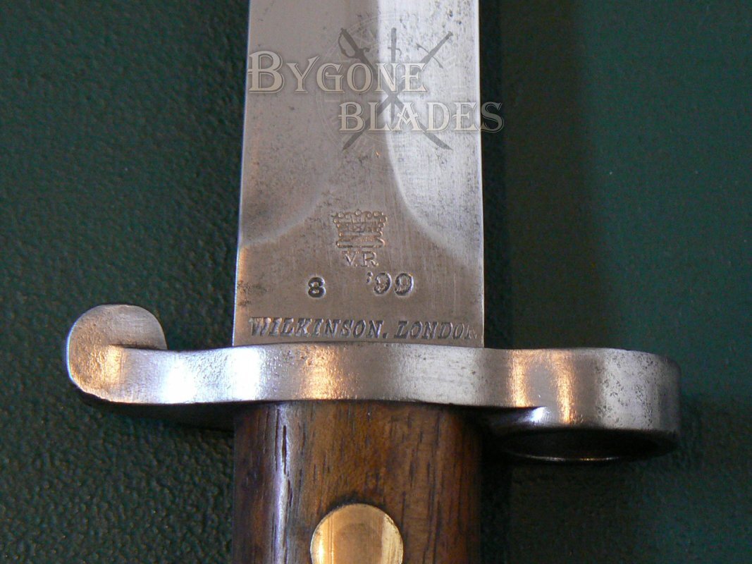 This Victorian bayonet is in excellent condition for its 121 years of age and is highly collectable. The 303mm double-edged blade is nicely marked on the ricasso with a flat crown and VR (Victoria Regina) and the production date, 8 ‘99 (August 1899) above the maker’s name, Wilkinson, London.