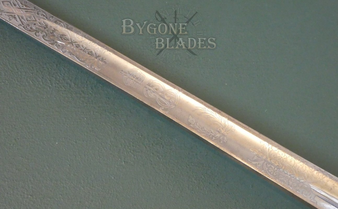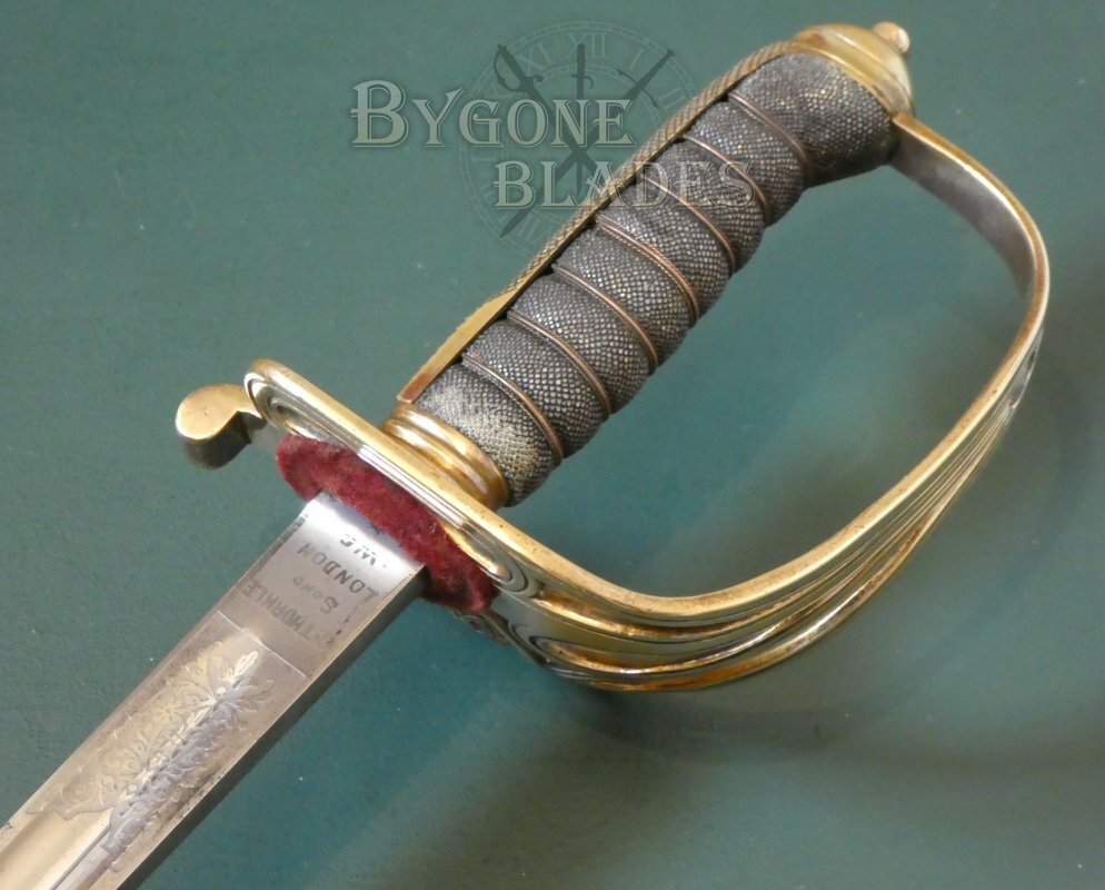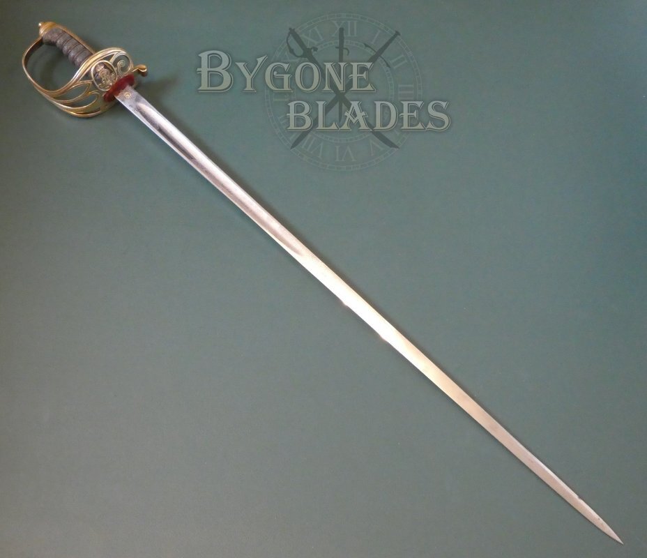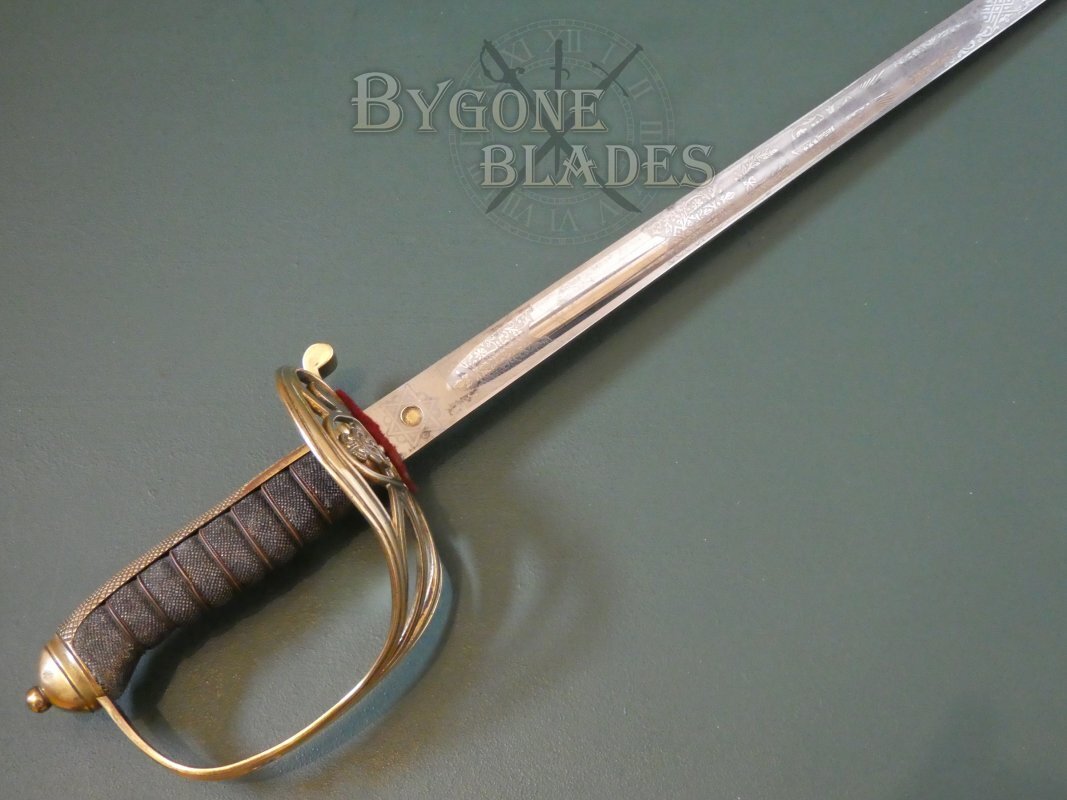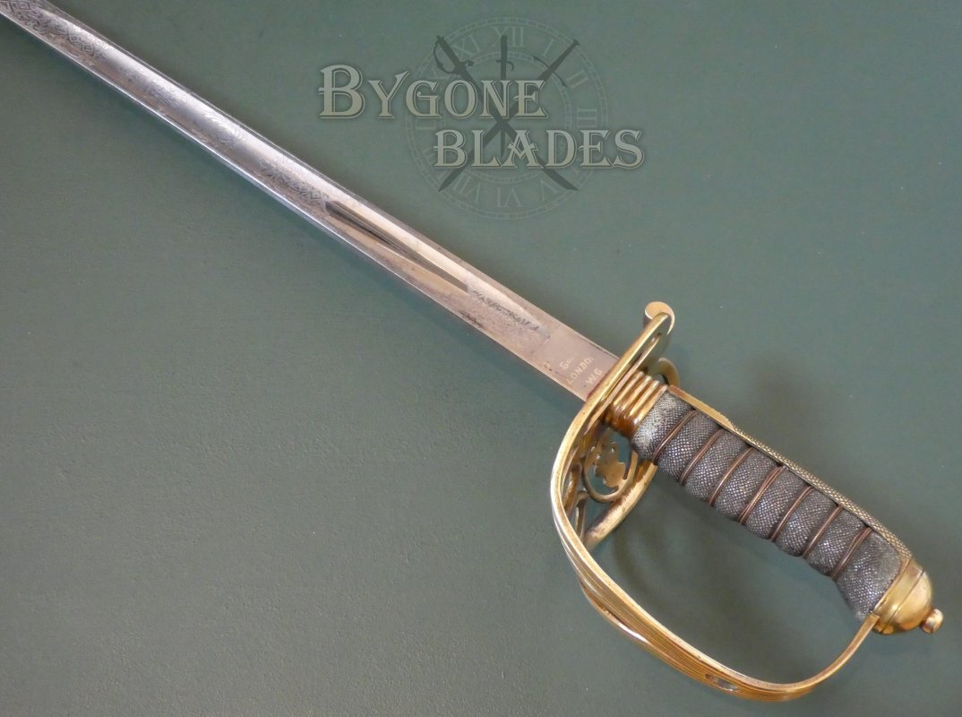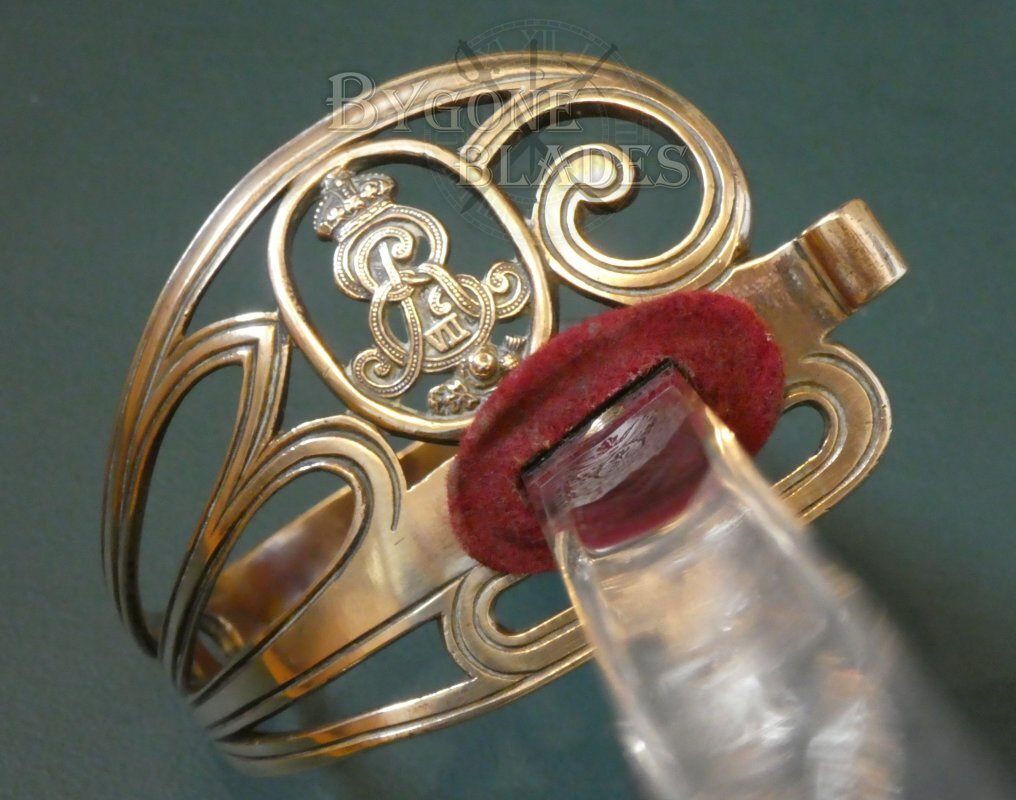 The Gothic brass hilt is in good condition. The guard bears the crowned ER VII cypher of King Edward VII (1901-1910). The knurled back strap is finished with an oval pommel and button. The shagreen grip is in good condition with minimal use and age related wear. The blade is firm in the hilt.