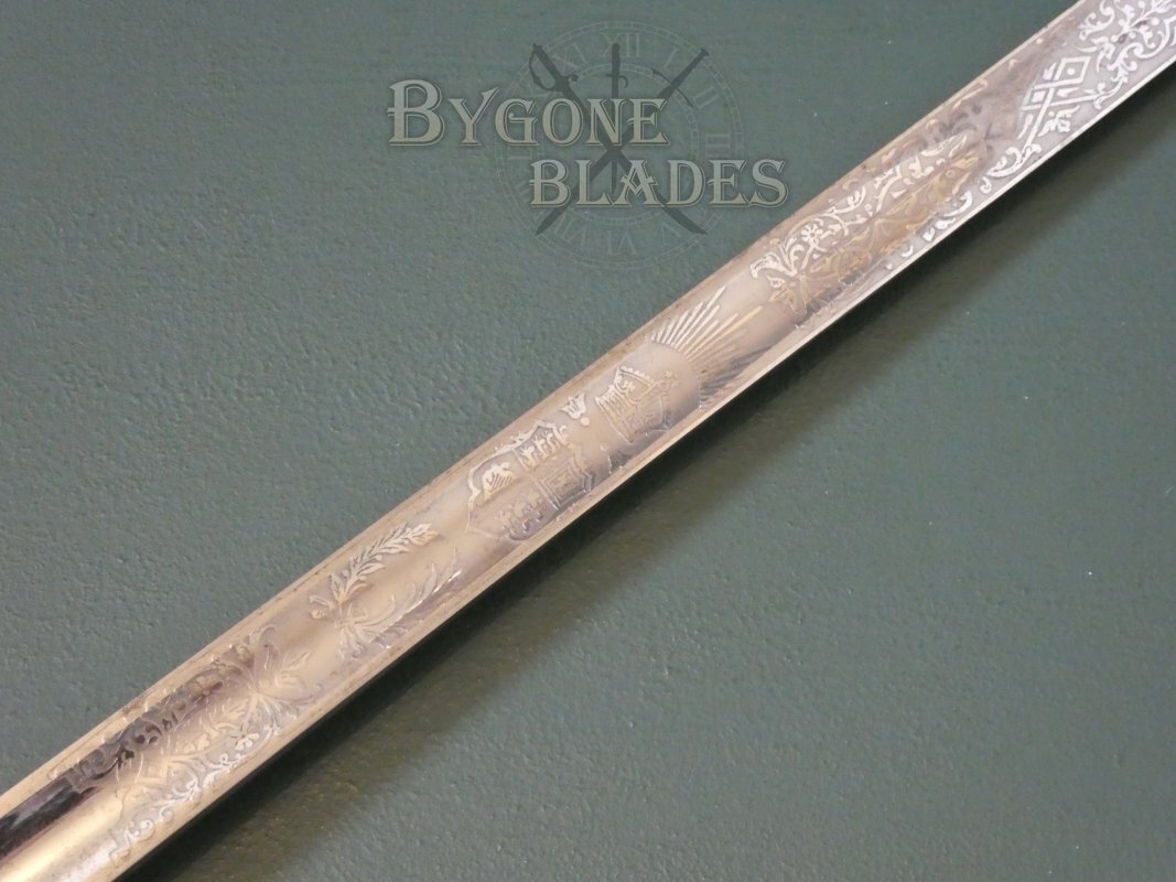 The blade is in excellent condition with minimal age related discolouration and is deeply etched with panels of foliate scrollwork, the royal coat of arms and Edwardian crown above crossed laurel and palm fronds. The obverse is similarly etched and includes the crowned cypher of king Edward VII above crossed laurel and palm, all bordered with intricate geometric and foliate scrollwork. The ricasso bears the retailer’s details, “C. Thurkle, Soho, London. W.G.”