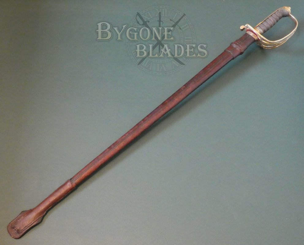 The sword is complete with its early pattern brown leather field scabbard with German silver throat. The scabbard is in good condition, missing its frog strap and with slight damage to the shoe and some loss to the original polished finish. The stitching is intact and strong. The sword sheathes and draws smoothly and is held firmly within the scabbard.