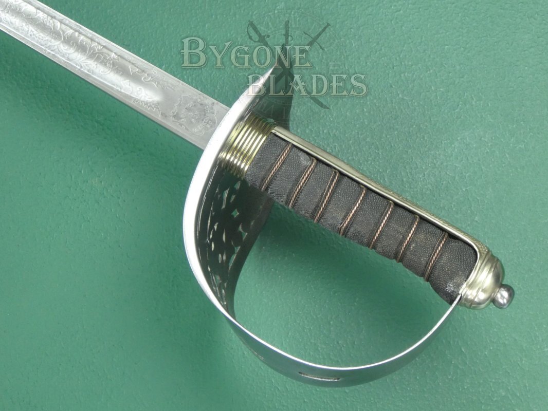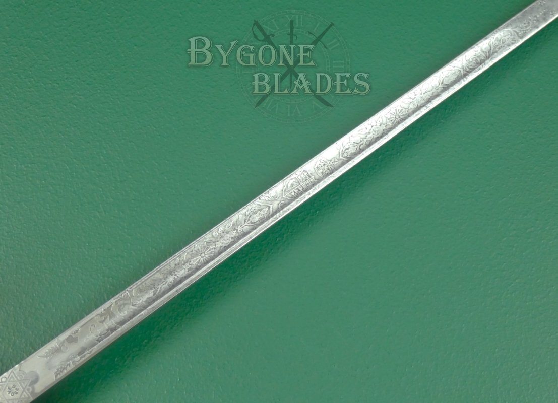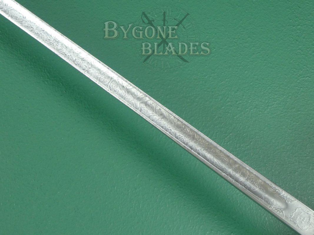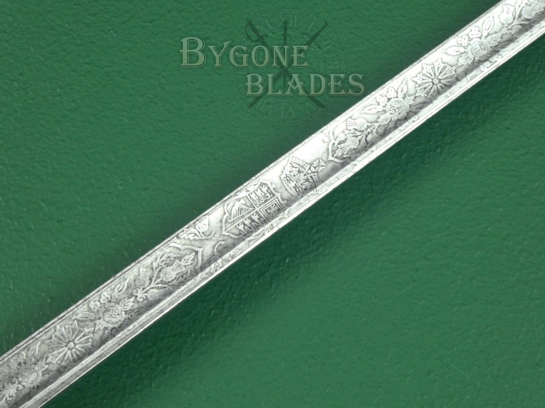 The 825mm thrusting blade is of dumbbell form with a short, wide central fuller on both sides and a flat spine tapering to a spear point. The spine is stamped with the serial number 2030. The blade is beautifully and bespoke etched along its length with the Flowers of the Union, the rose, thistle and shamrock. The Scottish thistle featuring prominently. Oak leaves and acorns are also present, the whole surmounted by arches and foliate scrollwork. The crowned cypher of King George V appears in the centre of the floral band. The obverse of the blade is similarly etched and features the crowned royal coat of arms. The intricate etching is clear and deep. The forte bears a pair of thistles and the ricasso is etched with interlocking triangles, stamped in the centre with the word “PROVED.” The obverse ricasso bears a shield containing the maker’s details, C. Boyton & Son, Clerkenwell. E. C. The blade is in good condition with mild speckles of tarnish and retains its original washer. The blade is firm in the hilt.