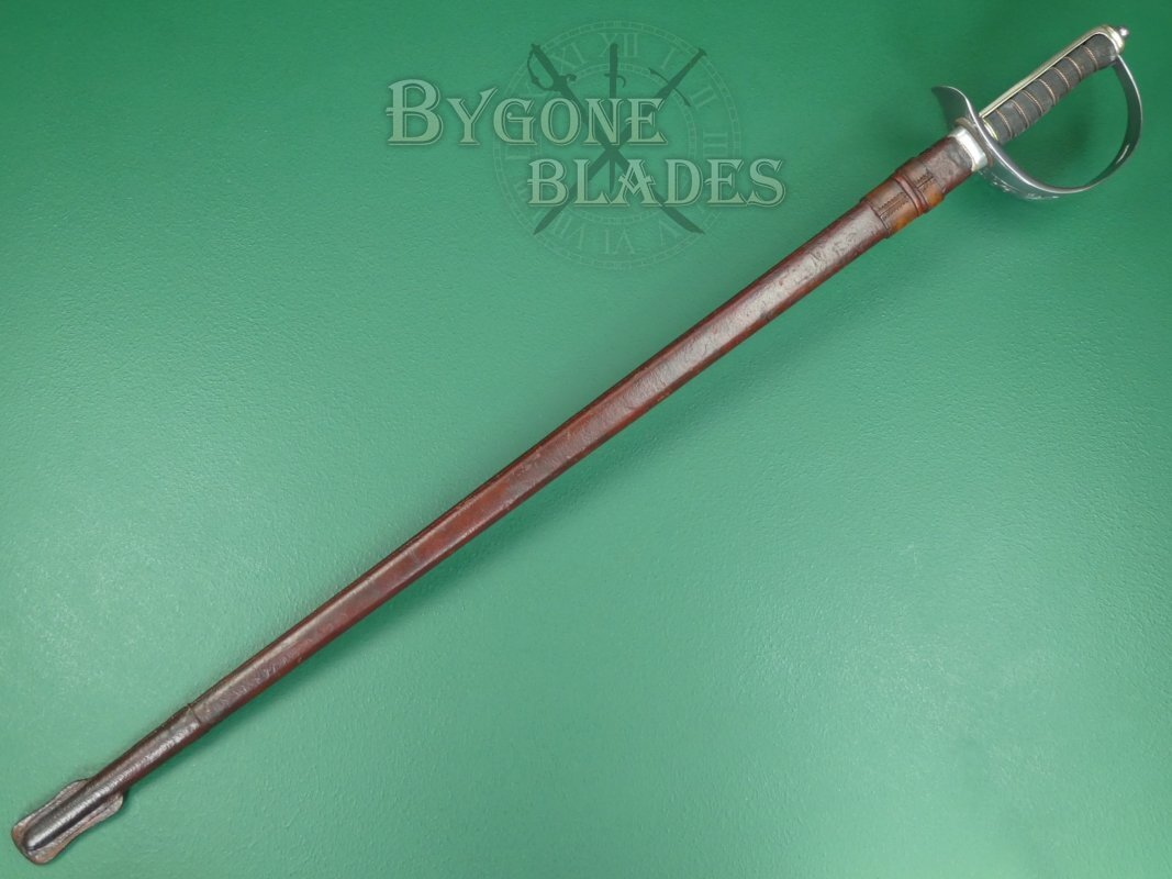 The brown leather covered field scabbard is in relatively good condition for its age and service. The stitching is intact and tight. The frog stap is missing and there are scuffs and marks consistent with use. The throat of the scabbard is aluminium instead of the usual plated steel or German silver. Again, probably due to wartime expediency and shortages. The sword sheaths and draws smoothly and is held firmly in the scabbard.