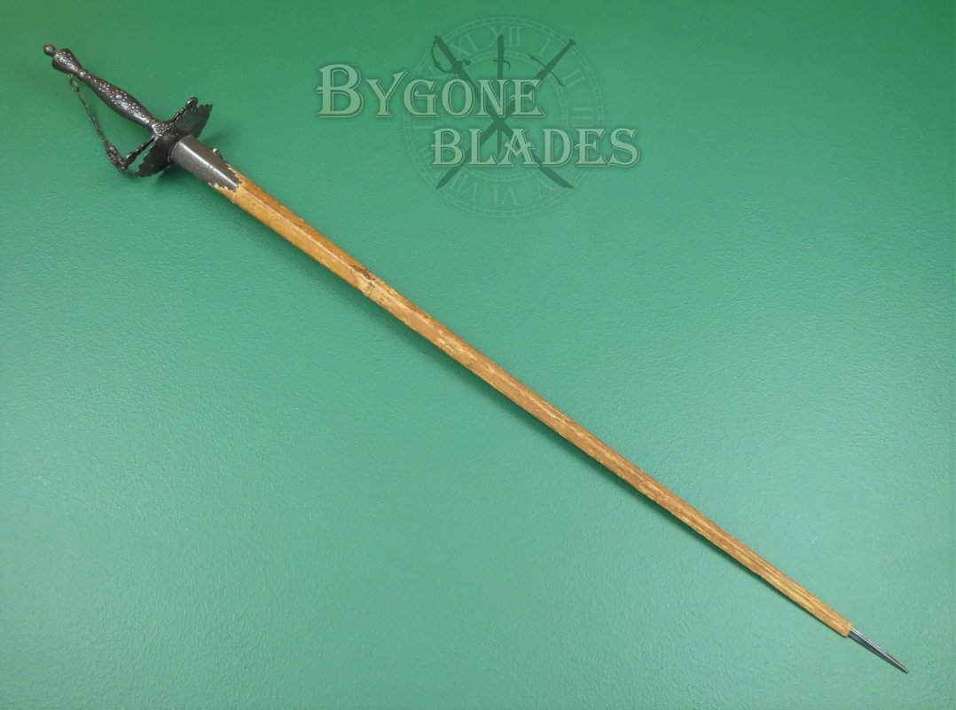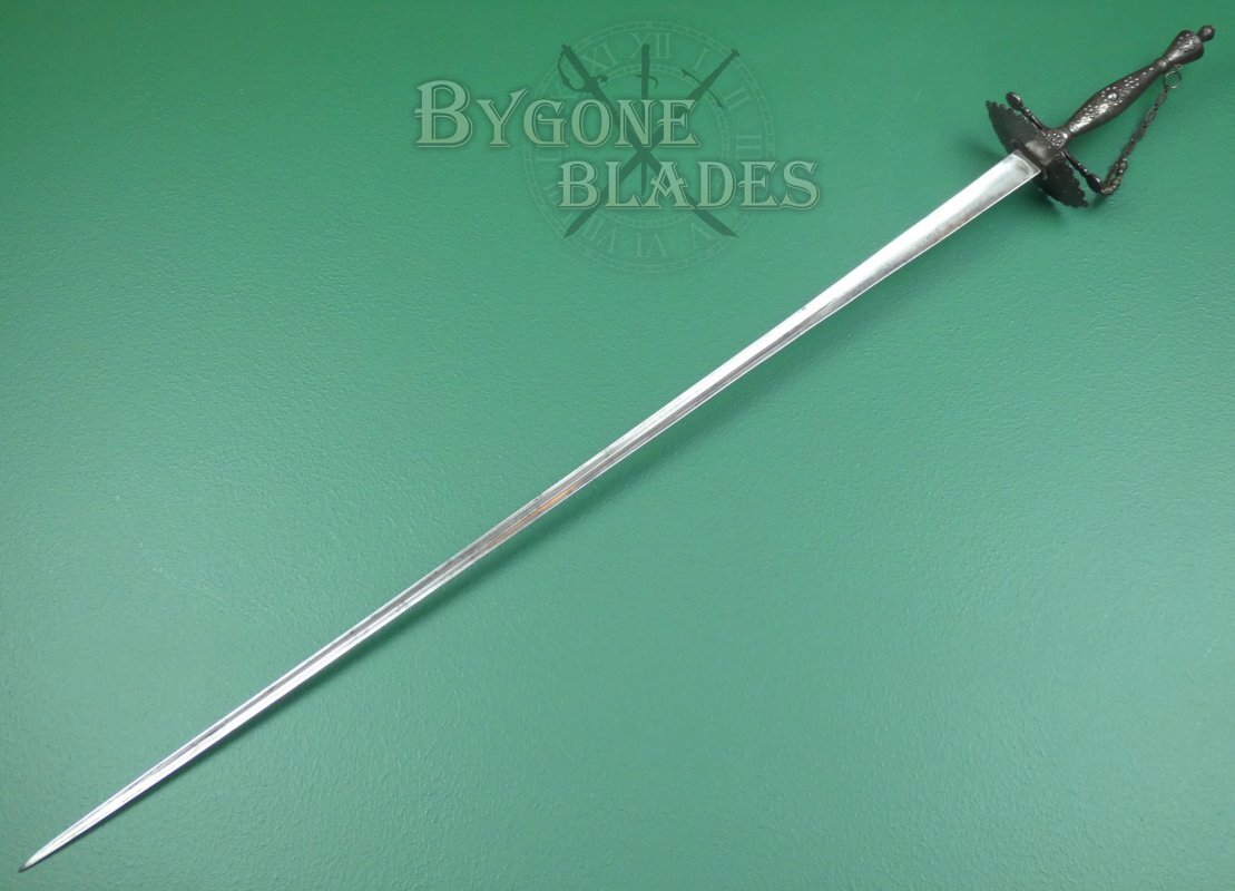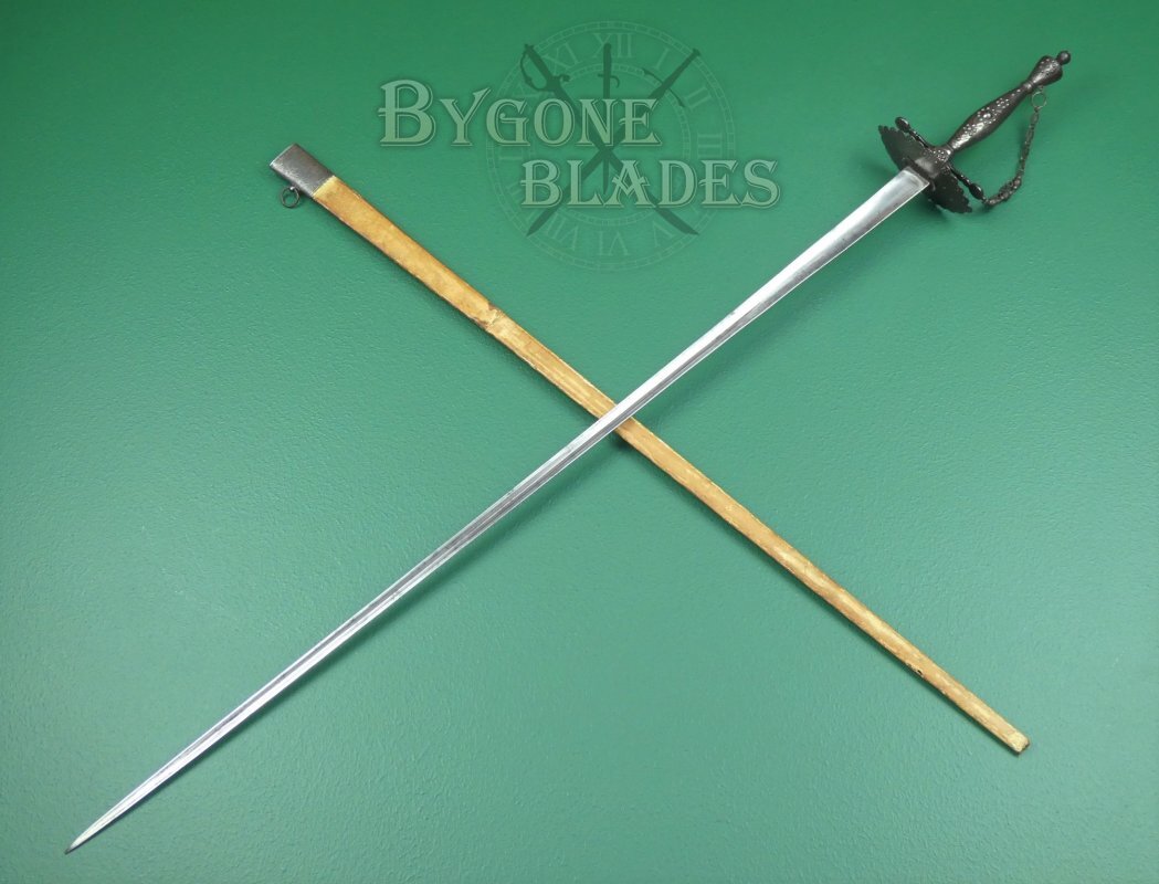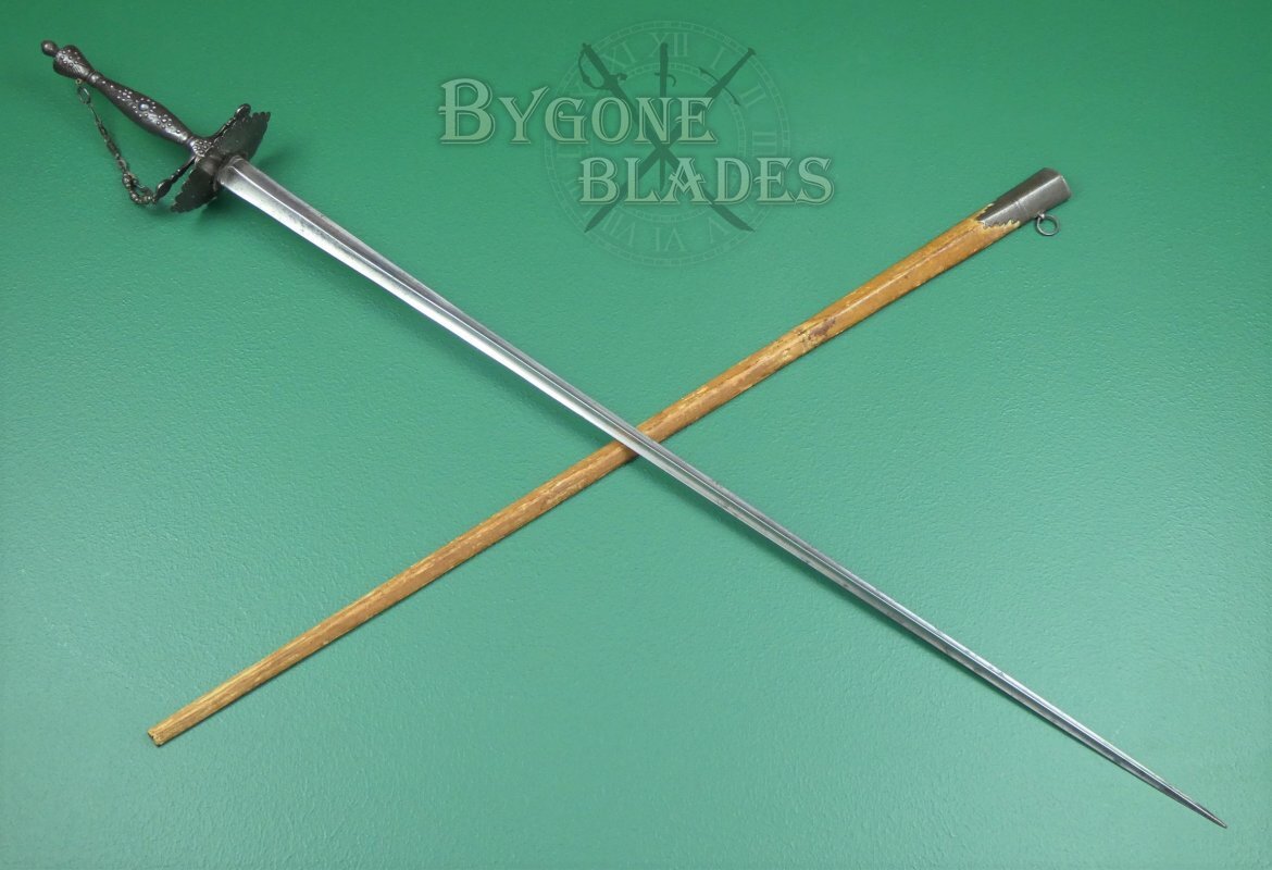This beautiful smallsword is complete with its original vellum scabbard with steel locket incorporating a single suspension ring. The vellum is in very good condition and remains strong. The scabbard is missing its chape and the vellum has age related staining and colouration. The sword sheathes and draws smoothly and is held firmly within the scabbard.