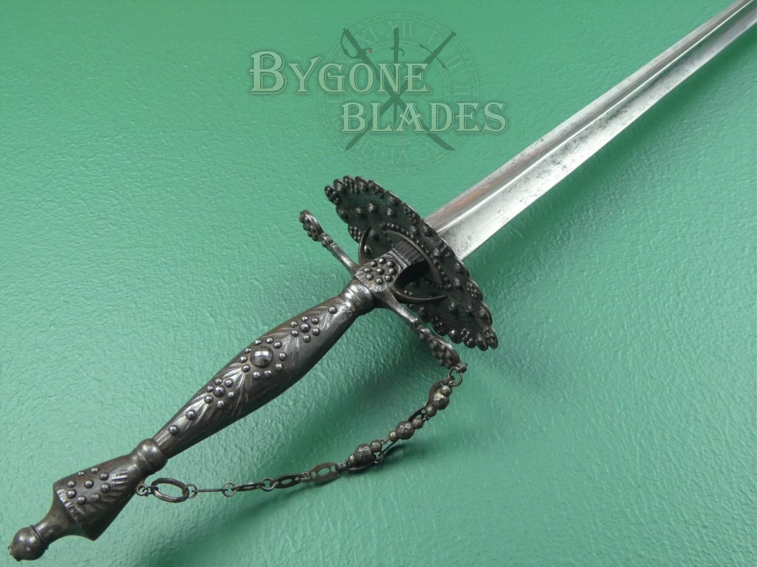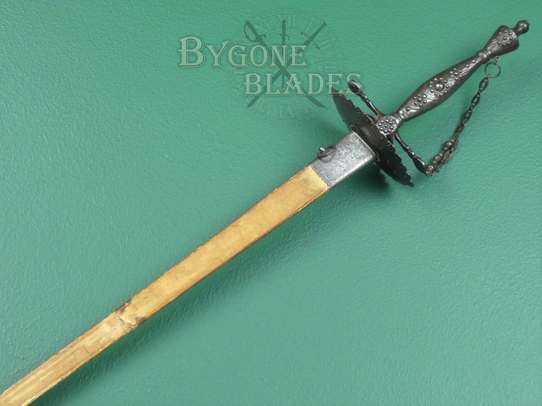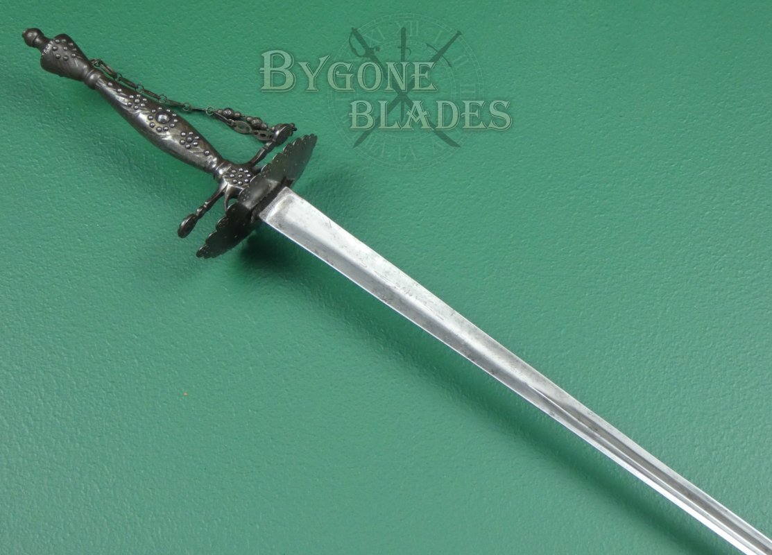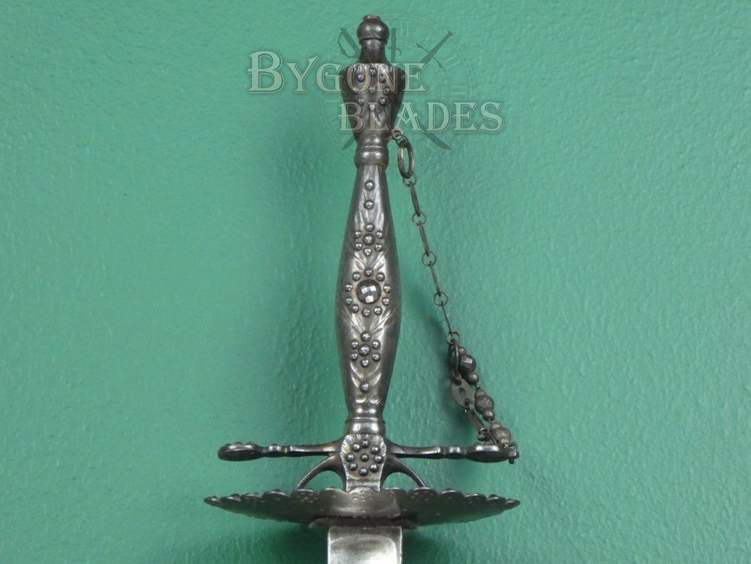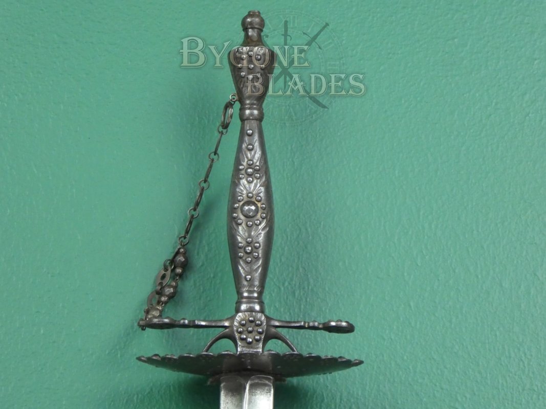 The hilt retains its original beaded chain guard which links the urn pommel to the flower head quillon. There is some small movement in the elliptical, slightly dished guard which is itself beautifully beaded and incised. The quality and attention to detail is magnificent. The blade is firm in the hilt.