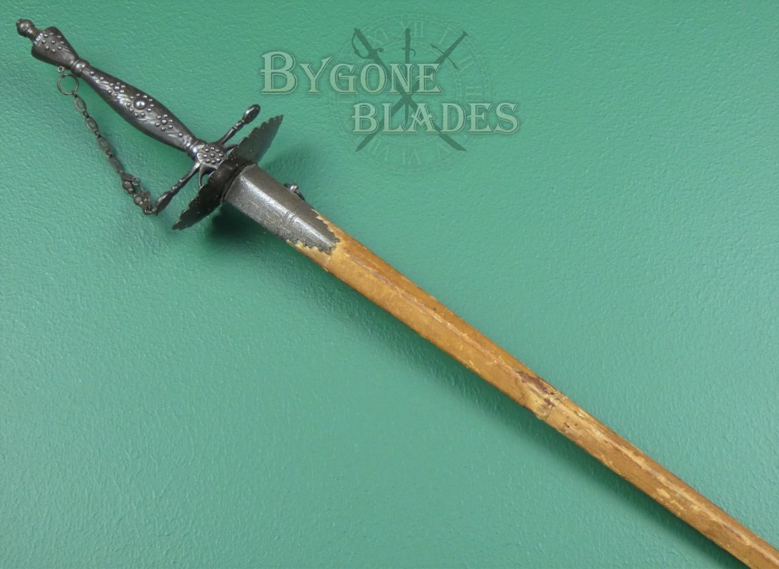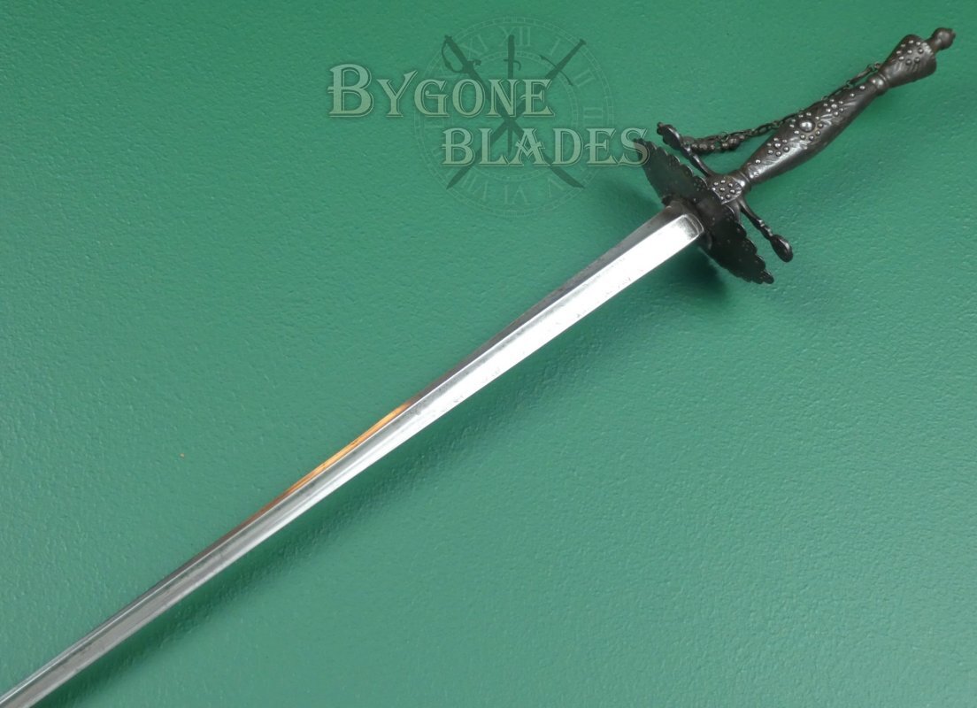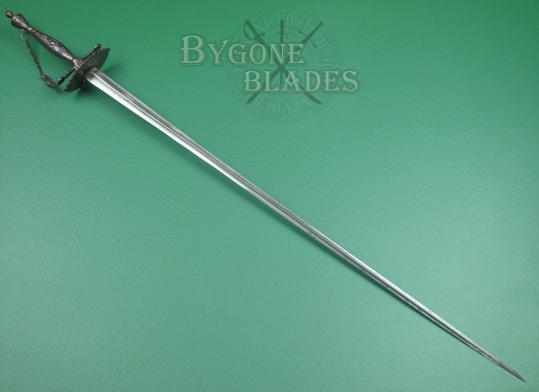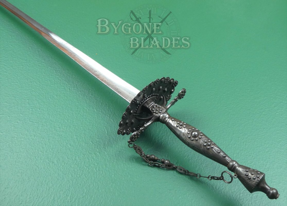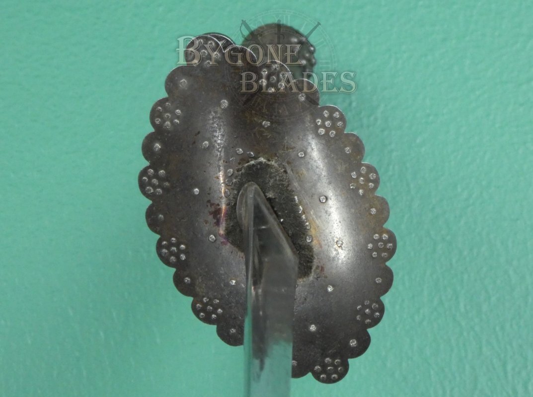 The hilt retains its original beaded chain guard which links the urn pommel to the flower head quillon. There is some small movement in the elliptical, slightly dished guard which is itself beautifully beaded and incised. The quality and attention to detail is magnificent. The blade is firm in the hilt.