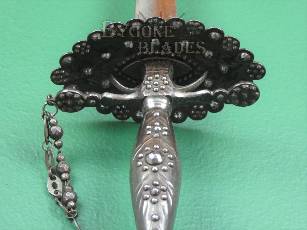 The beautiful cut steel hilt is in excellent condition and intricately decorated with the faceted steel beads that give the sword its name. The steel beads were each handmade and cut (faceted) like gems so as to sparkle in the sunshine and reflected candlelight of the period. The stylised floral arrangement of the beads is typical of Boultons’ work. The beads are linked by incised lines representing stems and leaves.