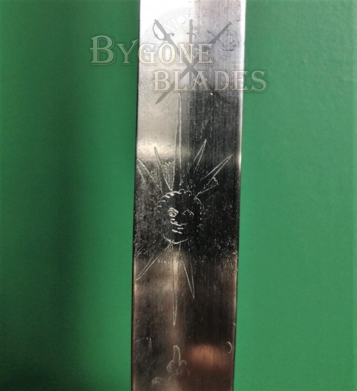 The 800mm, hollow ground tri-form blade is 25mm wide at the shoulder and is in very good condition. The blade is without rust or damage and retains traces of the original engraving, showing a faced sun, partial stand of arms and foliate scrollwork. Boulton only produced the cut steel hilts and imported the blades for his swords from Germany, believing them to be of superior quality to those produced within the UK at the time. The blade retains its original velvet washer.