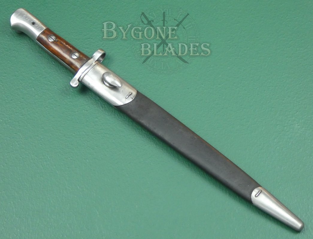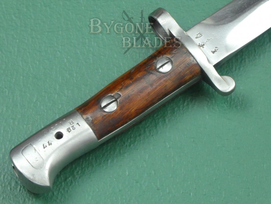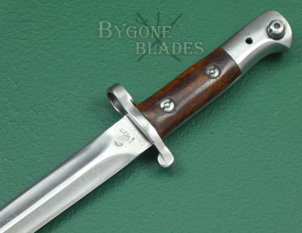 The P1903 design combined the P1888 blade and crosspiece with a new pommel design. Many 1903 pattern bayonets are actually P1888 bayonets that have been converted. This bayonet is a good example of a converted 1888.