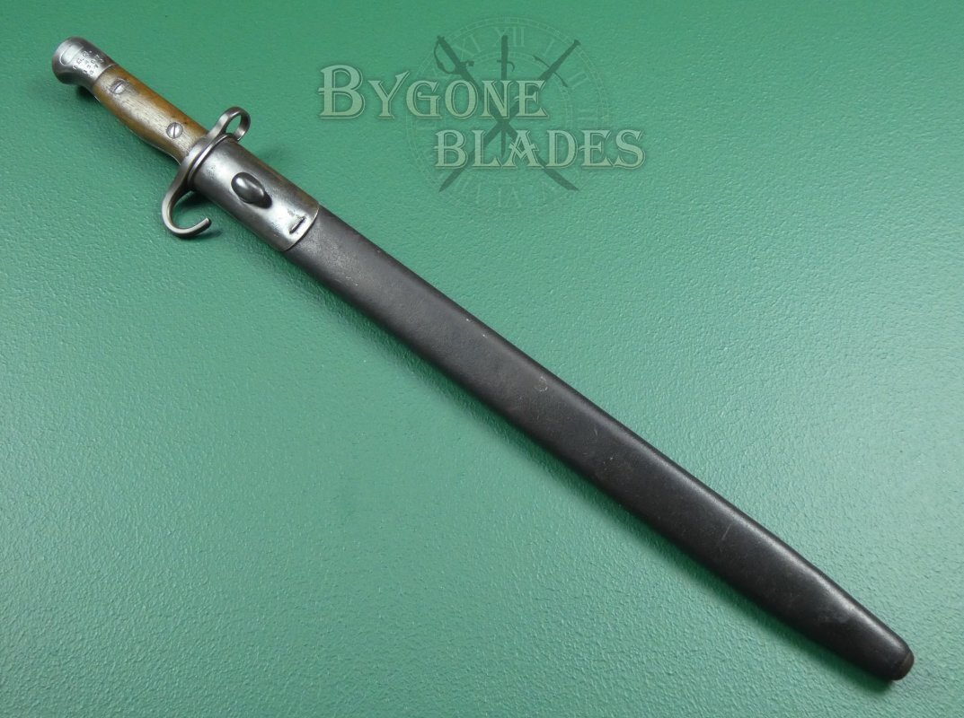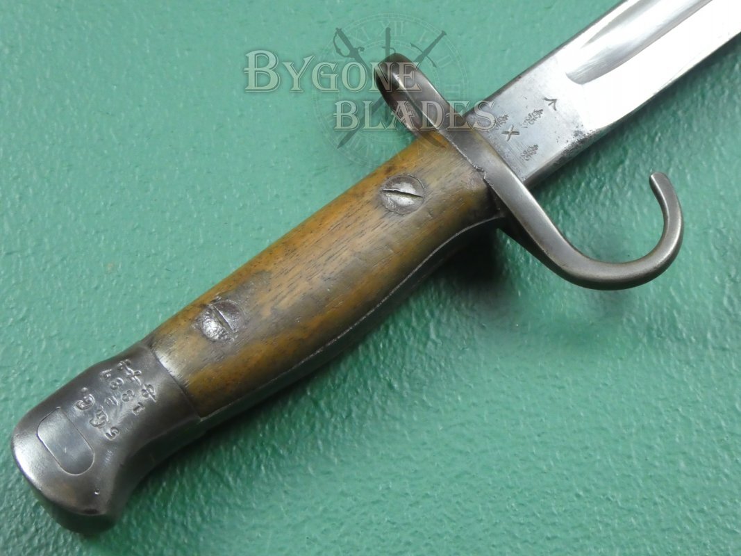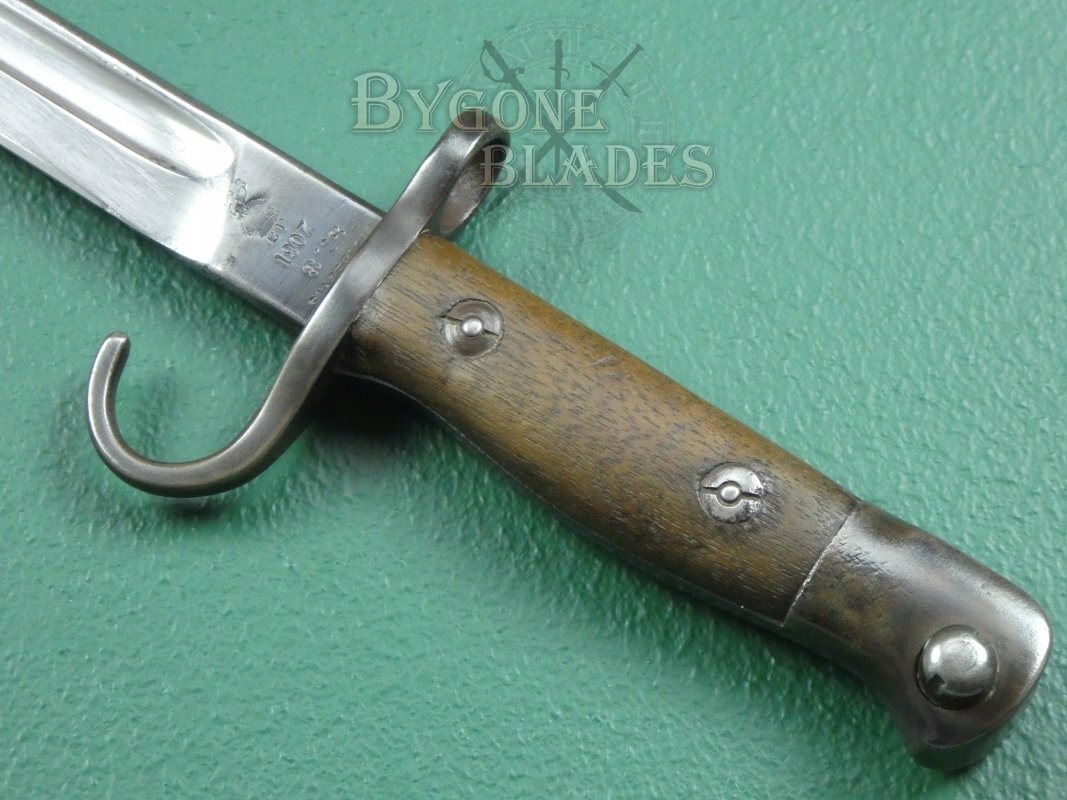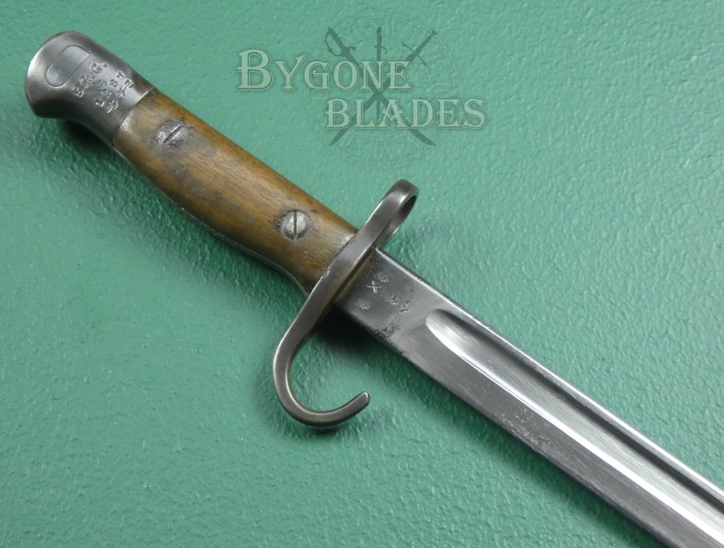Rare early production Hooked Quillon bayonet made by Sanderson of Sheffield in August 1908 and issued to the Grenadier Guards. 1908 was the first year of manufacture of the pattern 1907 bayonet, only one P1907 bayonet having been produced in 1907 as a pattern example.
