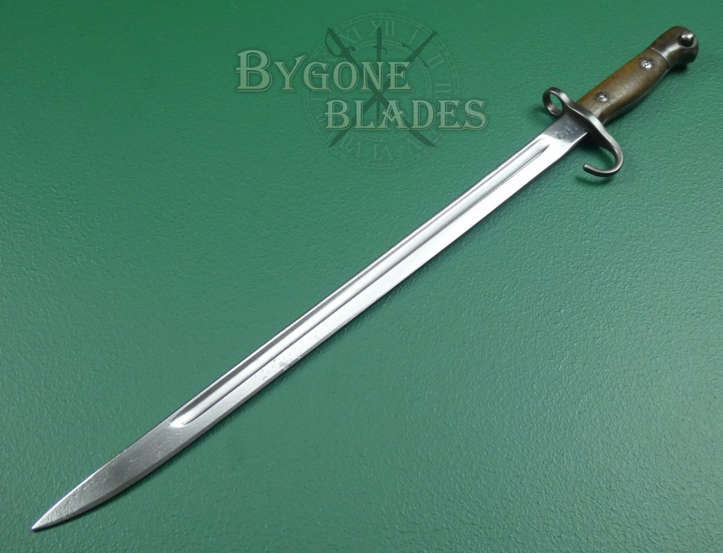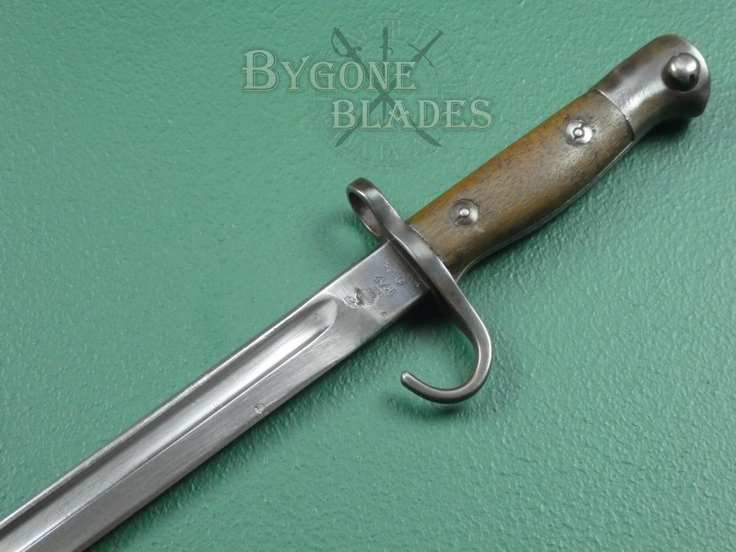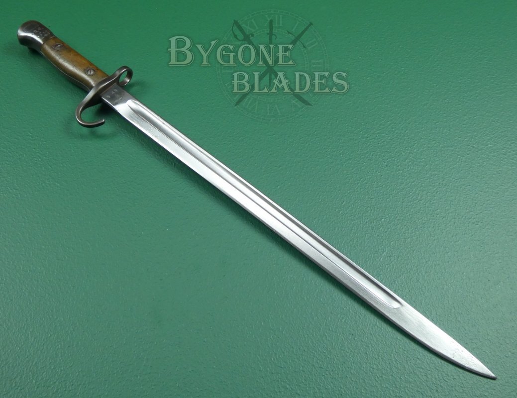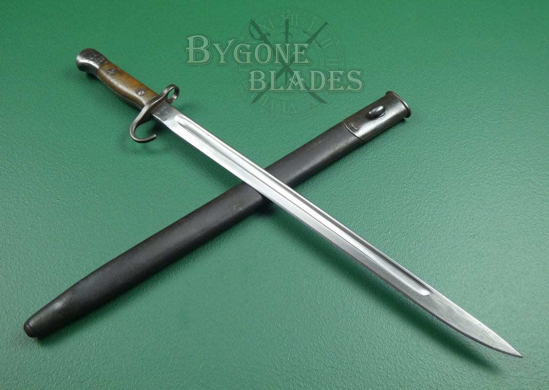 Rare early production Hooked Quillon bayonet made by Sanderson of Sheffield in August 1908 and issued to the Grenadier Guards. 1908 was the first year of manufacture of the pattern 1907 bayonet, only one P1907 bayonet having been produced in 1907 as a pattern example.