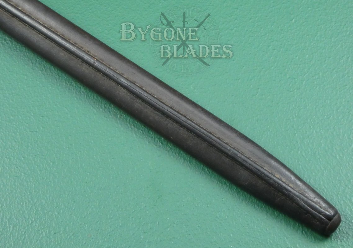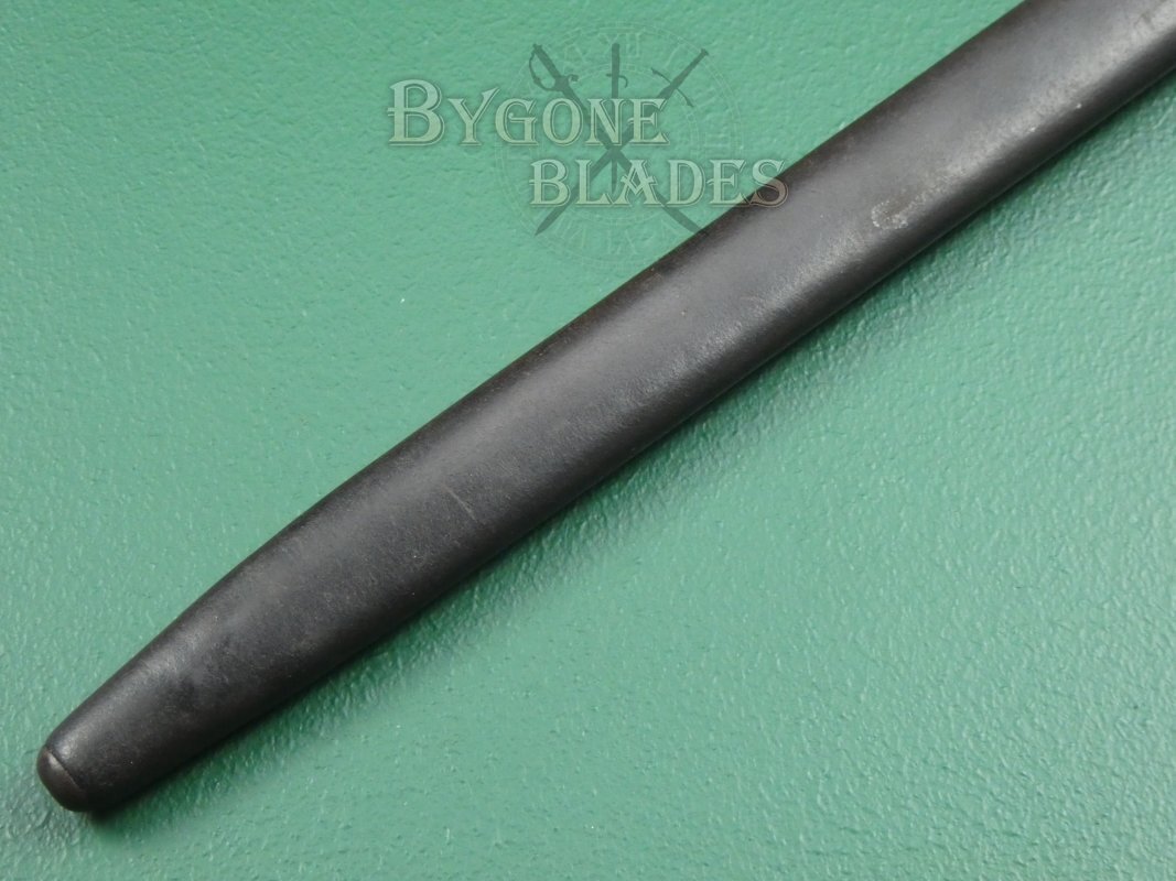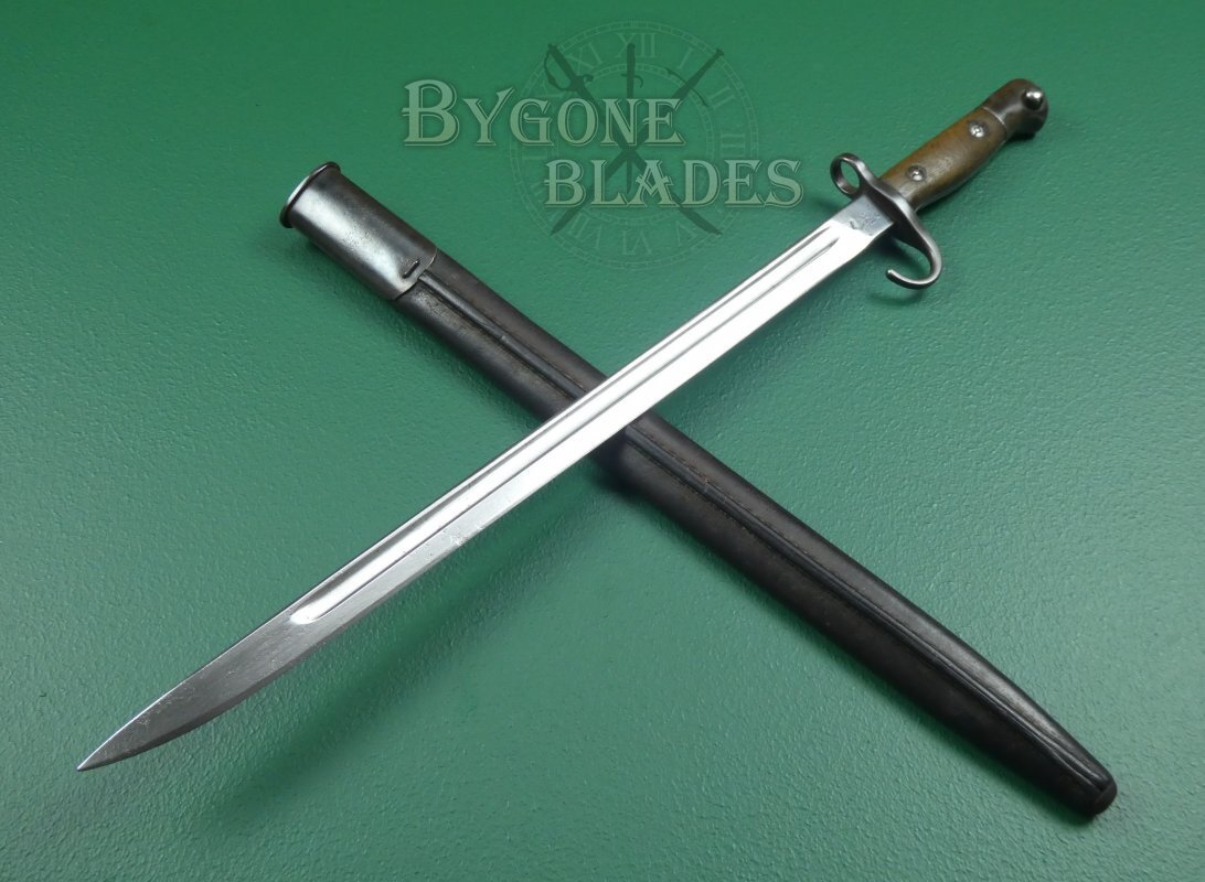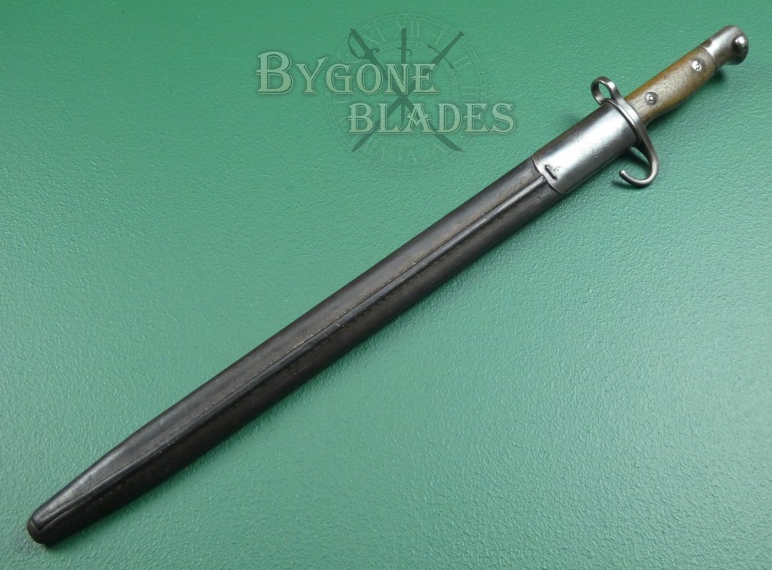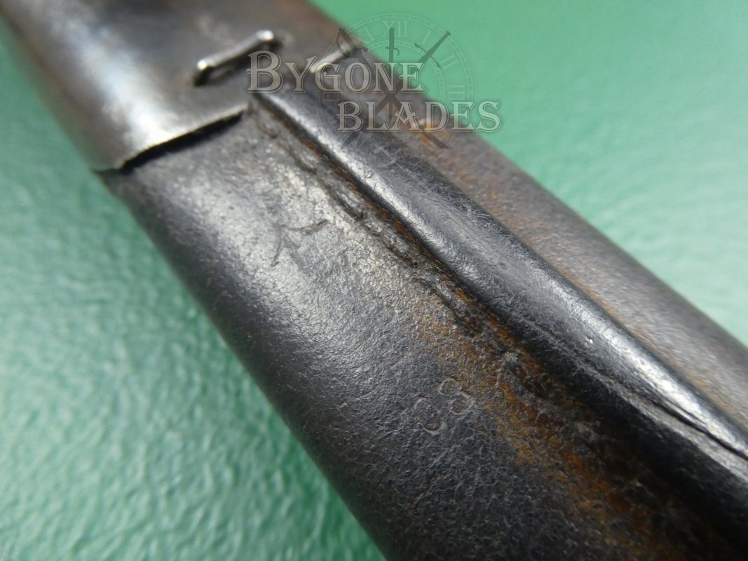 The bayonet is complete with its very rare No1 Mk l leather scabbard with an internal chape and a teardrop frog stud. The Mk I scabbard was only produced for one year, between April 1908 and April 1909.