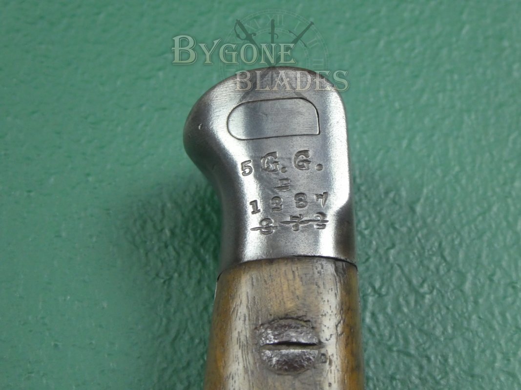 The hooked quilloned crosspiece retains its original blueing, as does the steel pommel. There is some mild wear. The pommel is stamped with the regimental markings “5. G. G.” and the issue number “1287.” Beneath these markings are earlier issue stamps to the South Wales Borderers, with the cancelled issue number, 372. During WW1 this bayonet was re-issued to the 5th battalion The Grenadier Guards. The wooden grip scales are in good condition with some age and use related marks and are held firmly in place by the two original screws. The push button locking mechanism is in good condition and the action is crisp.