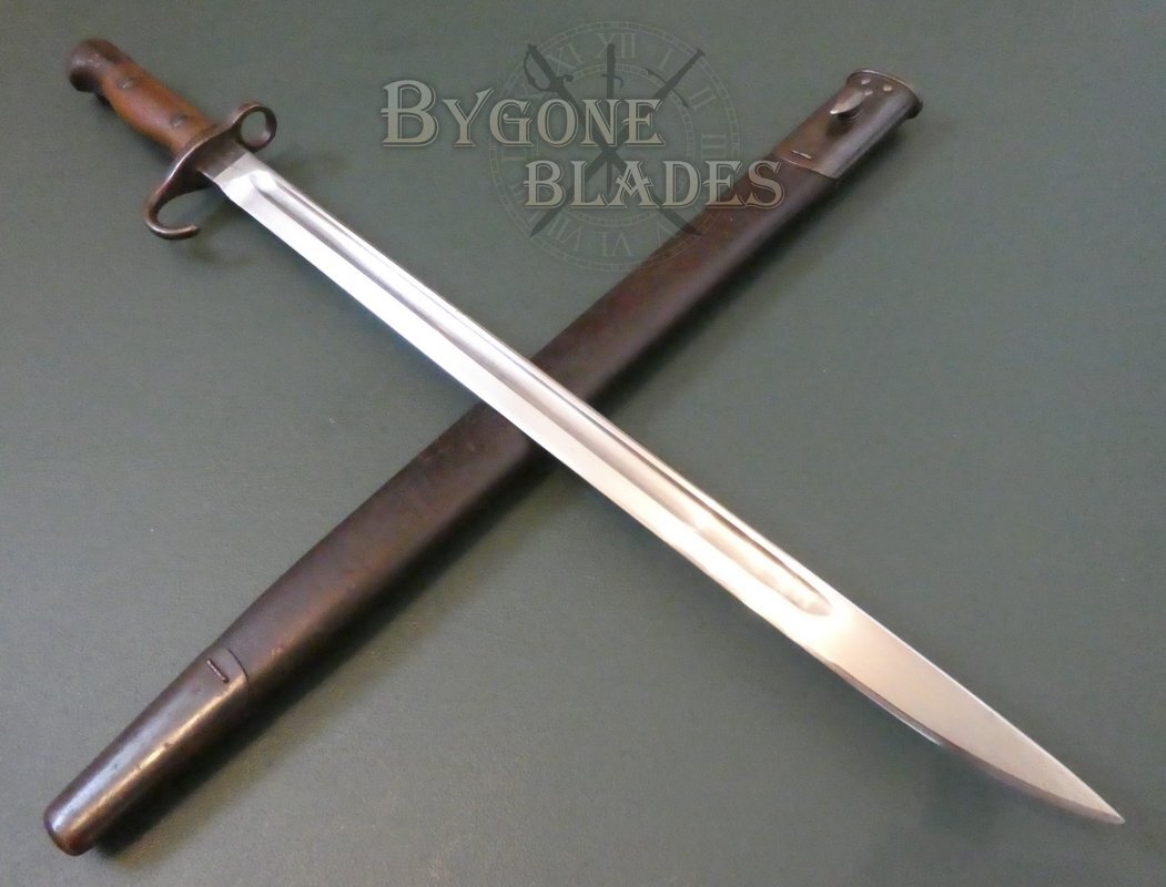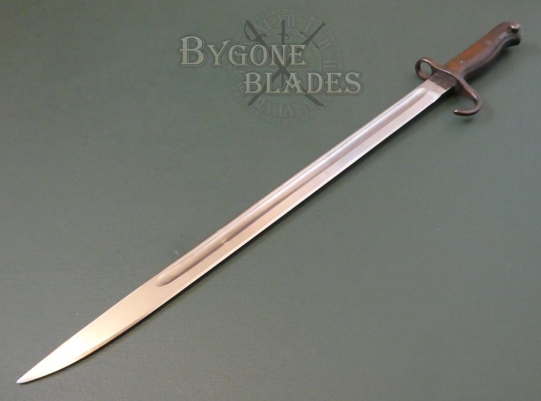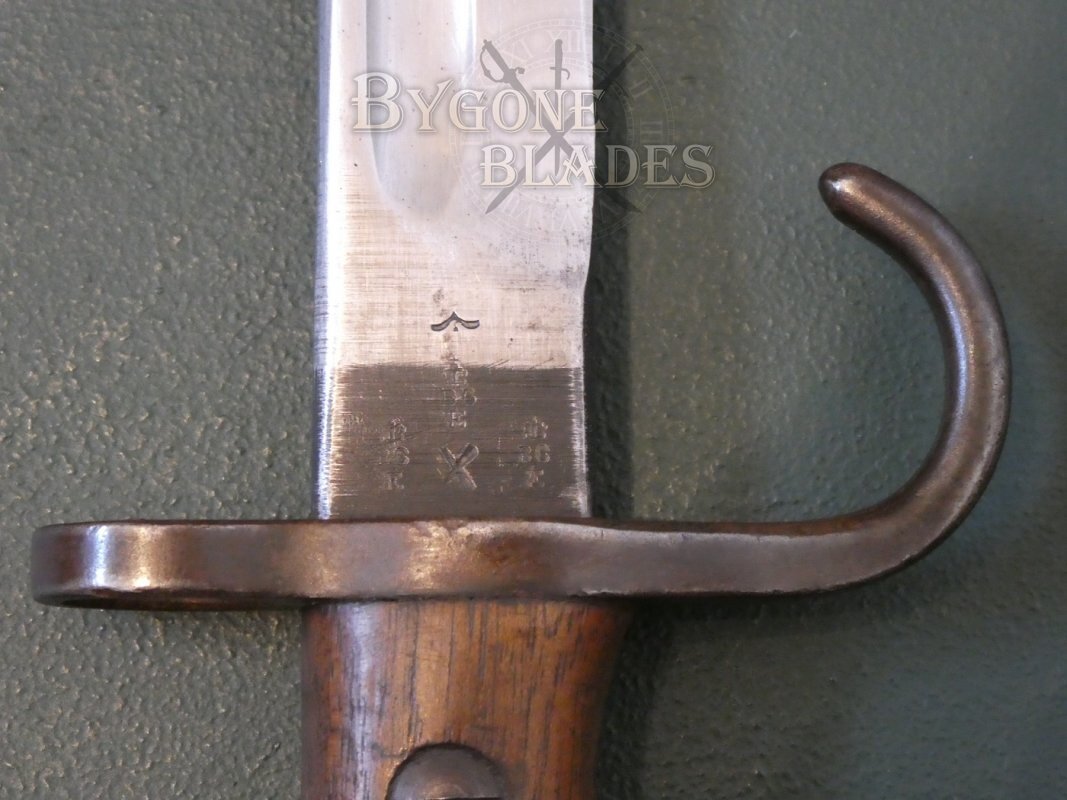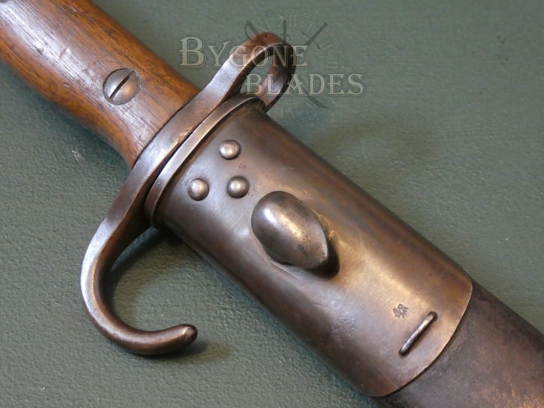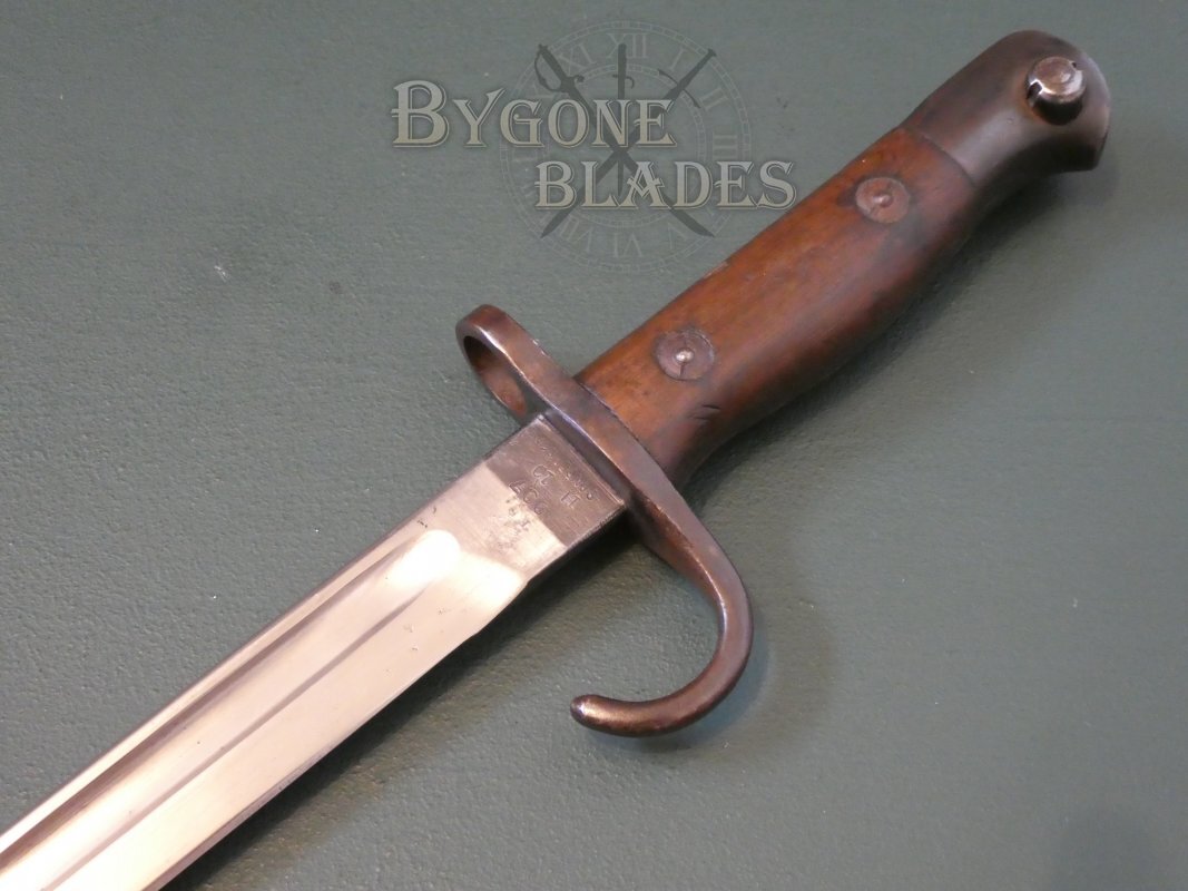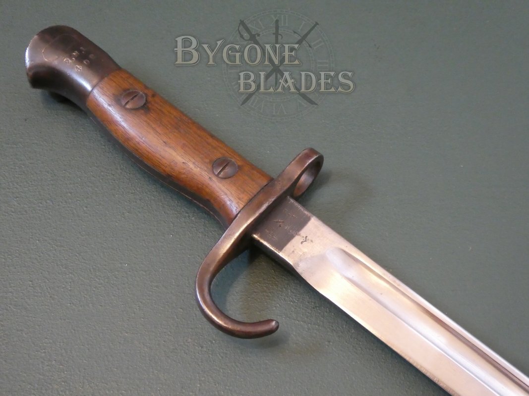 This is an excellent example of the iconic and rare British hooked quillon P1907 bayonet, unit marked to a British Line Infantry regiment that fought in East Africa during World War One.
