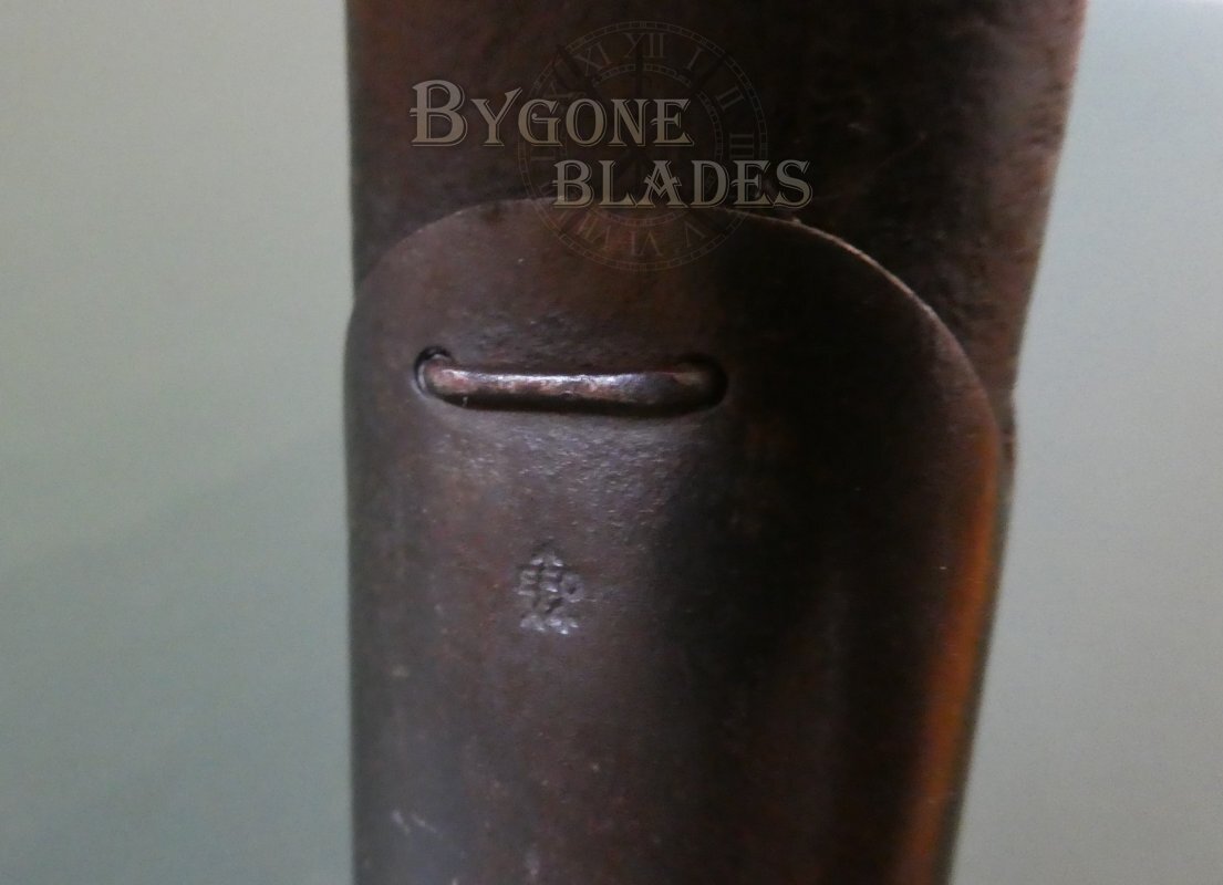 A leather loop was securely stitched to the seam of the scabbard to allow for the use of a leg tie. A leather thong would have been passed through the loop and tied around the soldier’s thigh to hold the bayonet flush against his leg to stop it from catching on the thick undergrowth of East Africa and to stop it from bouncing around when he moved.