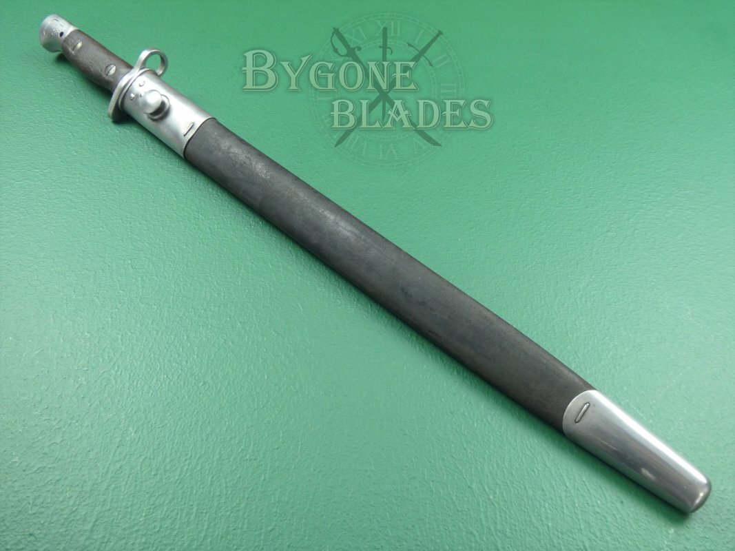 The bayonet is complete with its original leather scabbard with a round frog stud. The scabbard is in excellent condition. The steel locket and chape retain their original polished finish. The throat of the locket is stamped with the number 838.