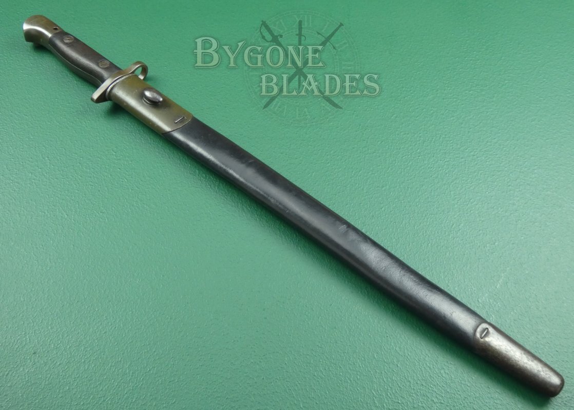 The bayonet is complete with its leather scabbard with a teardrop frog stud. The scabbard is in very good condition. The steel locket has wartime green paint and the chape retains its original blueing with some minor wear. The stitching is intact and strong and the bayonet sheathes smoothly and is held firmly within the scabbard.
