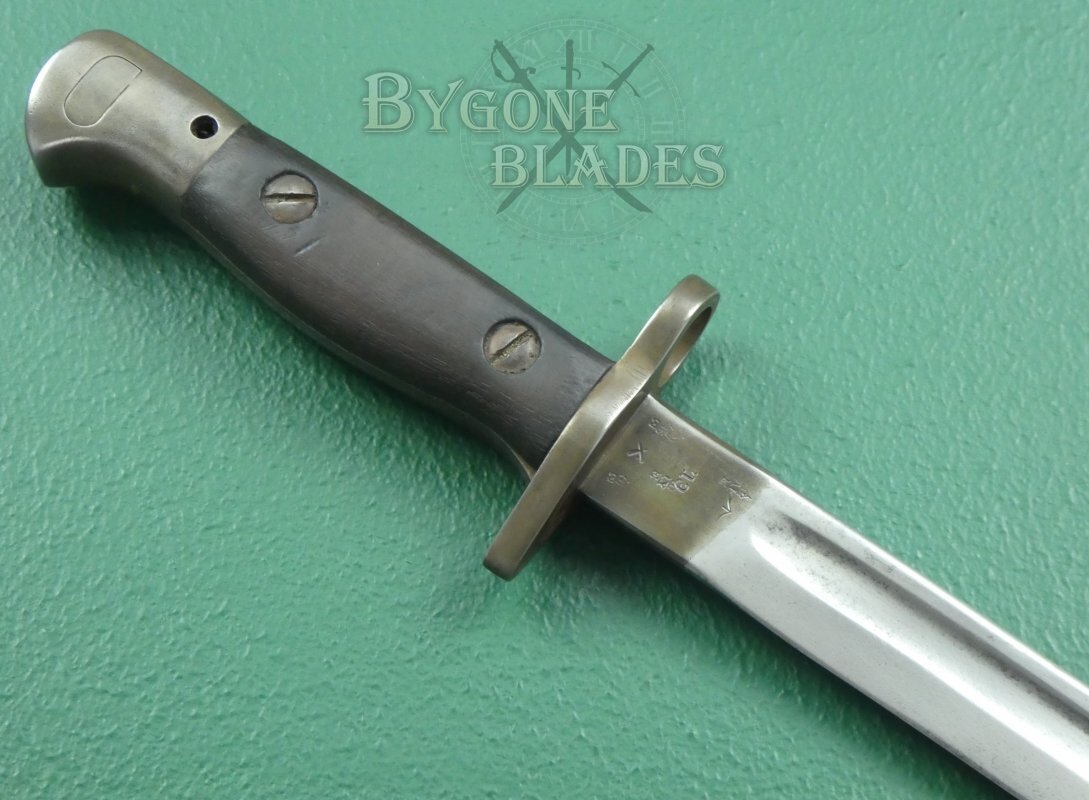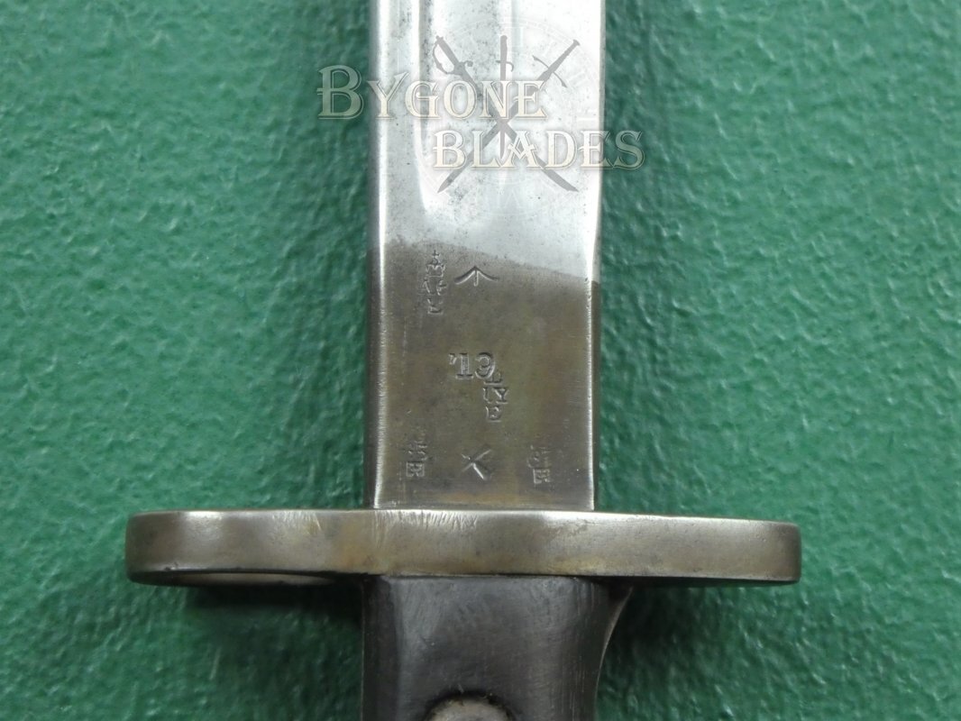 The obverse ricasso bears a bend test stamp, War Department arrow and three Enfield inspection and acceptance stamps. There is also an additional date stamp for 1919 and a corresponding reissue/inspection stamp.
