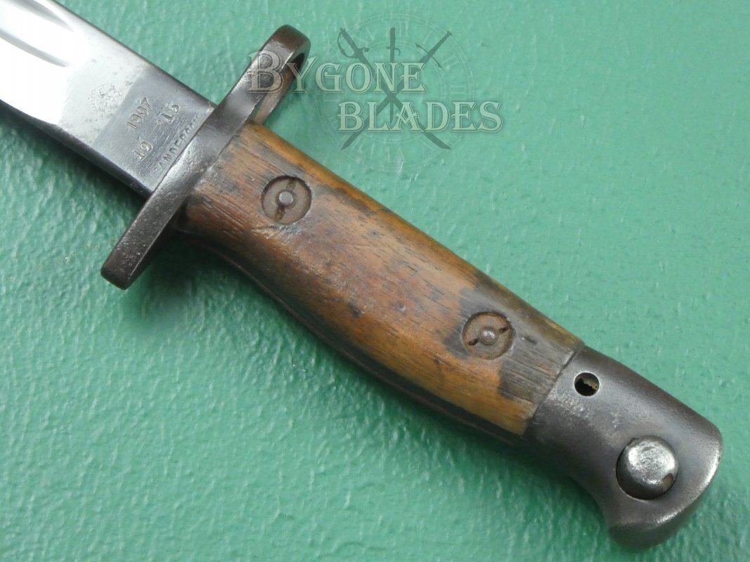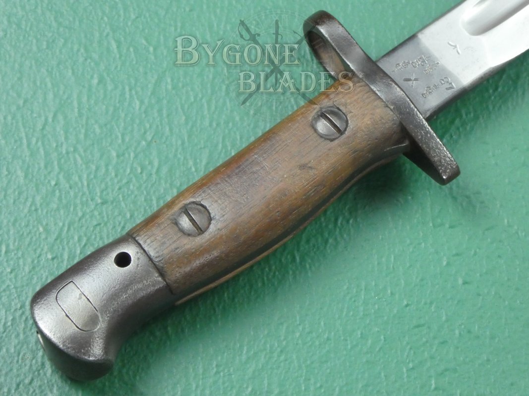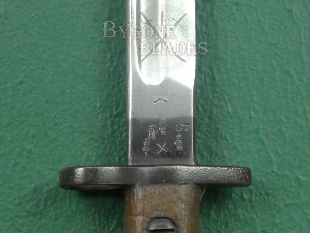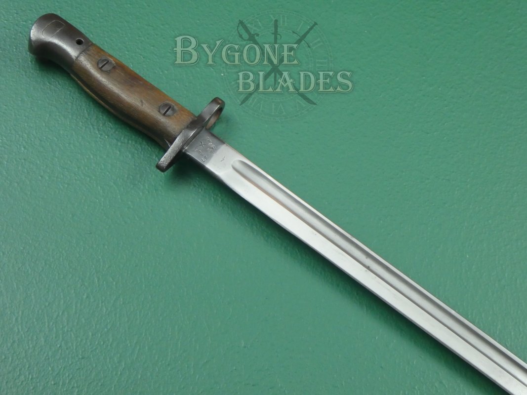 The obverse ricasso bears a bend test stamp, War Department arrow and four Enfield inspection and re-issue stamps along with a date stamp for 1927.