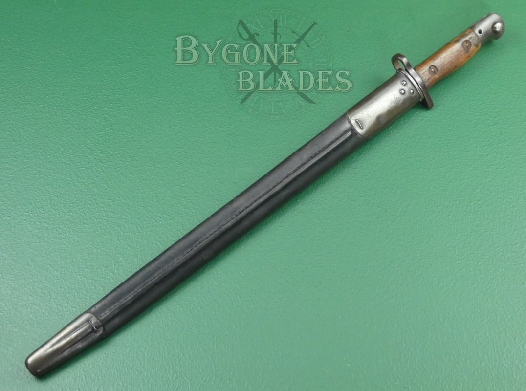 The bayonet is complete with its black leather scabbard with a teardrop rog stud. The scabbard is in very good condition with a small (strong) repair to the leading edge above the chape. The steel locket and chape retain their original blueing. The stitching is intact and strong and the bayonet sheathes smoothly and is held firmly within the scabbard.