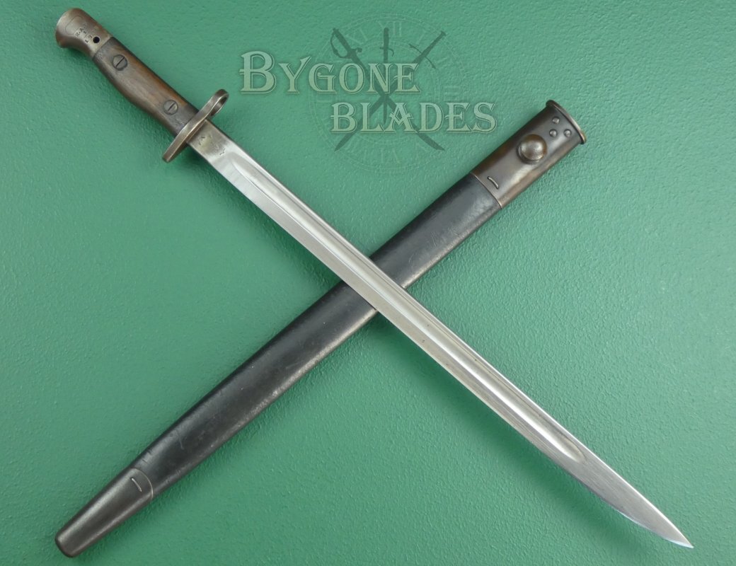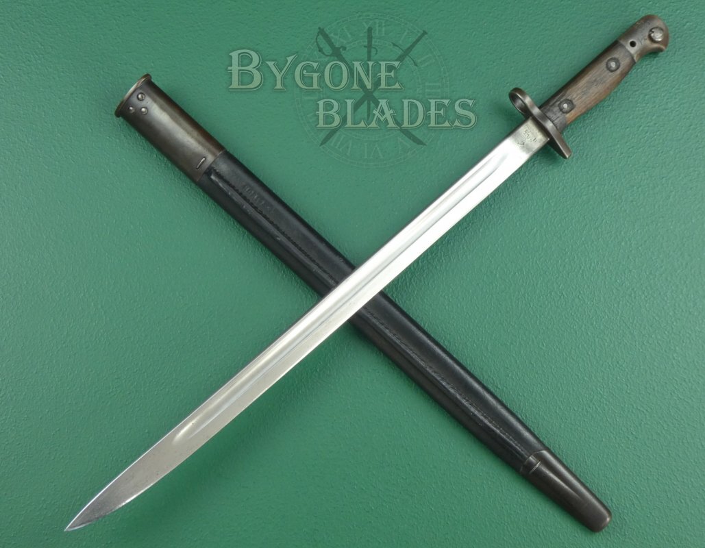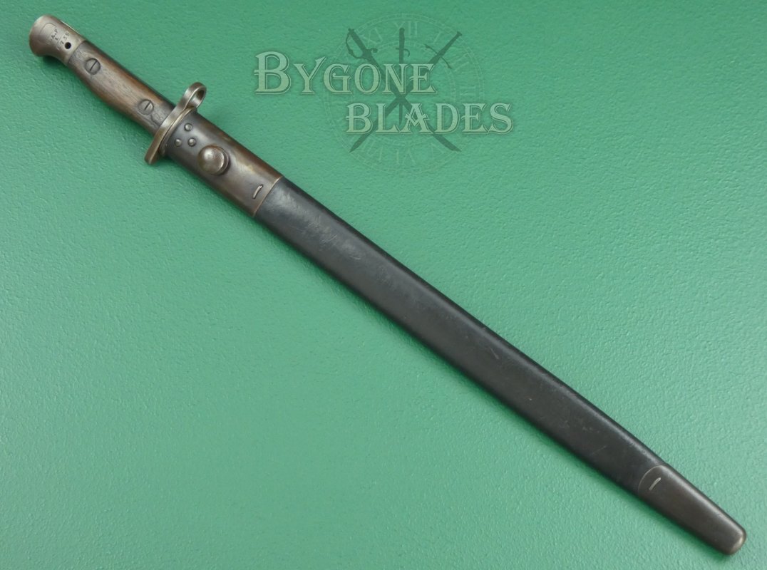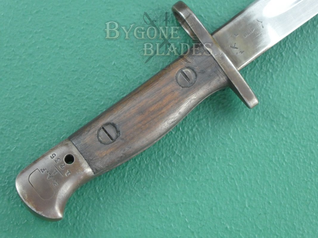 This is an excellent example of the iconic British World War One bayonet with rare, early Royal Air Force markings and matching scabbard.