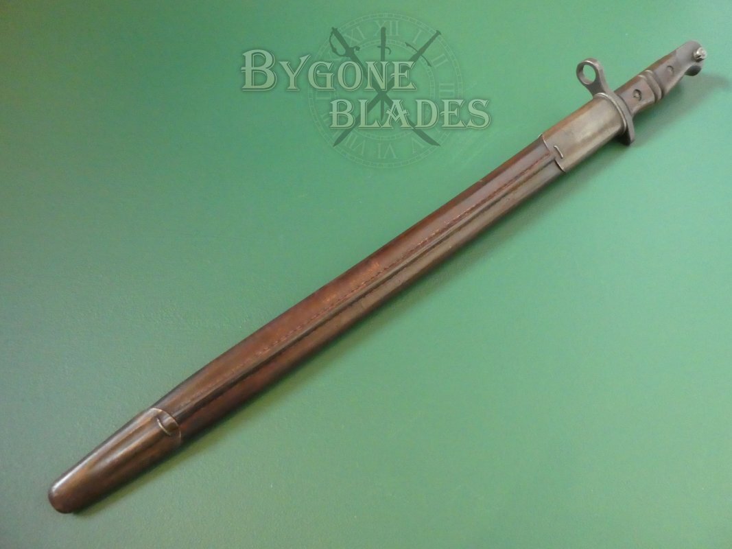 The bayonet is complete with its original brown leather scabbard with teardrop frog stud. The scabbard is in excellent condition. The locket and chape retain their original finish with minor wear. The leather is firm and undamaged with its original finish and the stitching is intact and strong.
