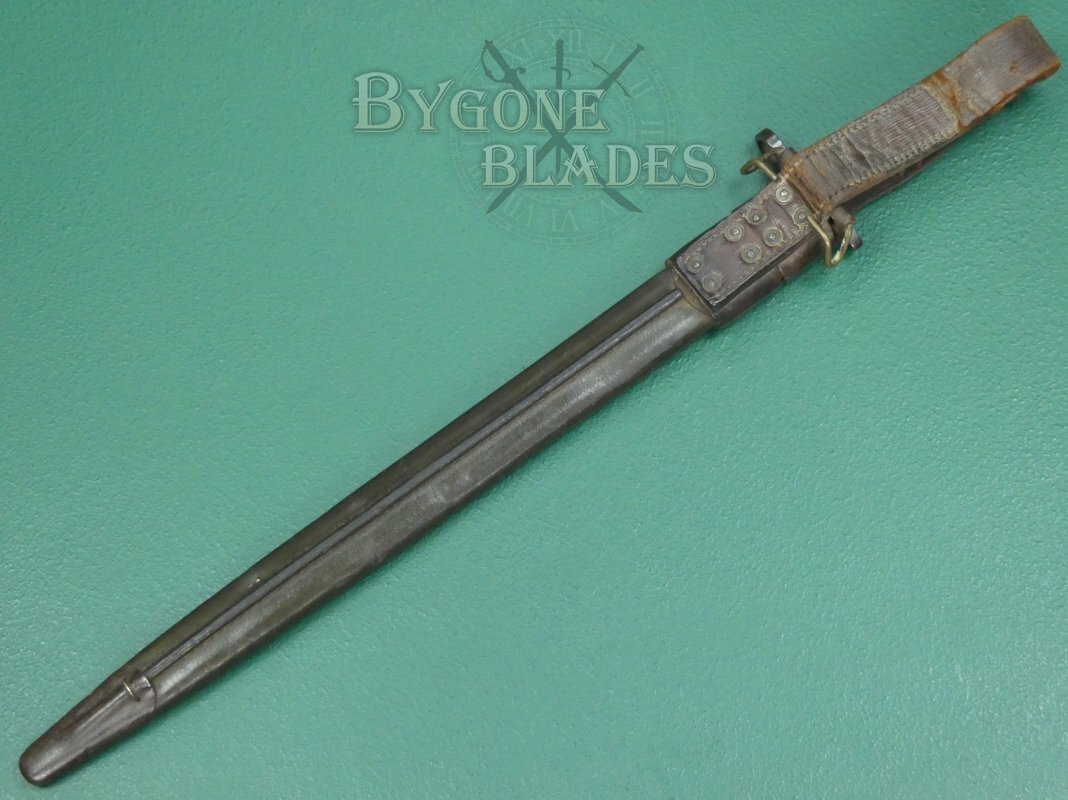 The bayonet is complete with its original American Mk II leather scabbard with integral belt hanger. The scabbard is fitted with a brown British 1939 pattern leather frog, suggesting that the bayonet was re-issued for Home Guard use during WW2. The scabbard and frog are in good condition with age-related scuffs and marks. The bayonet sheathes and draws smoothly and is held firmly within the scabbard.