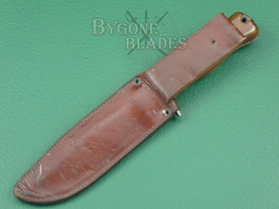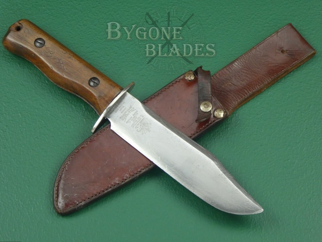 The 178mm heavy, Bowie-style blade is double-edged and terminates in a clip point. The unfullered blade retains very sharp edges. The blade is in good used condition with scuffs and scratches consistent with use.