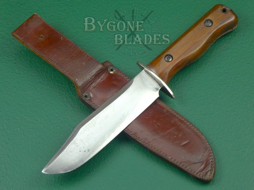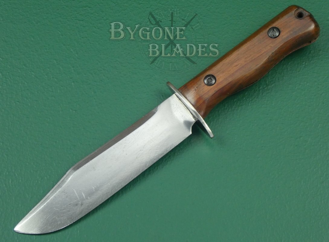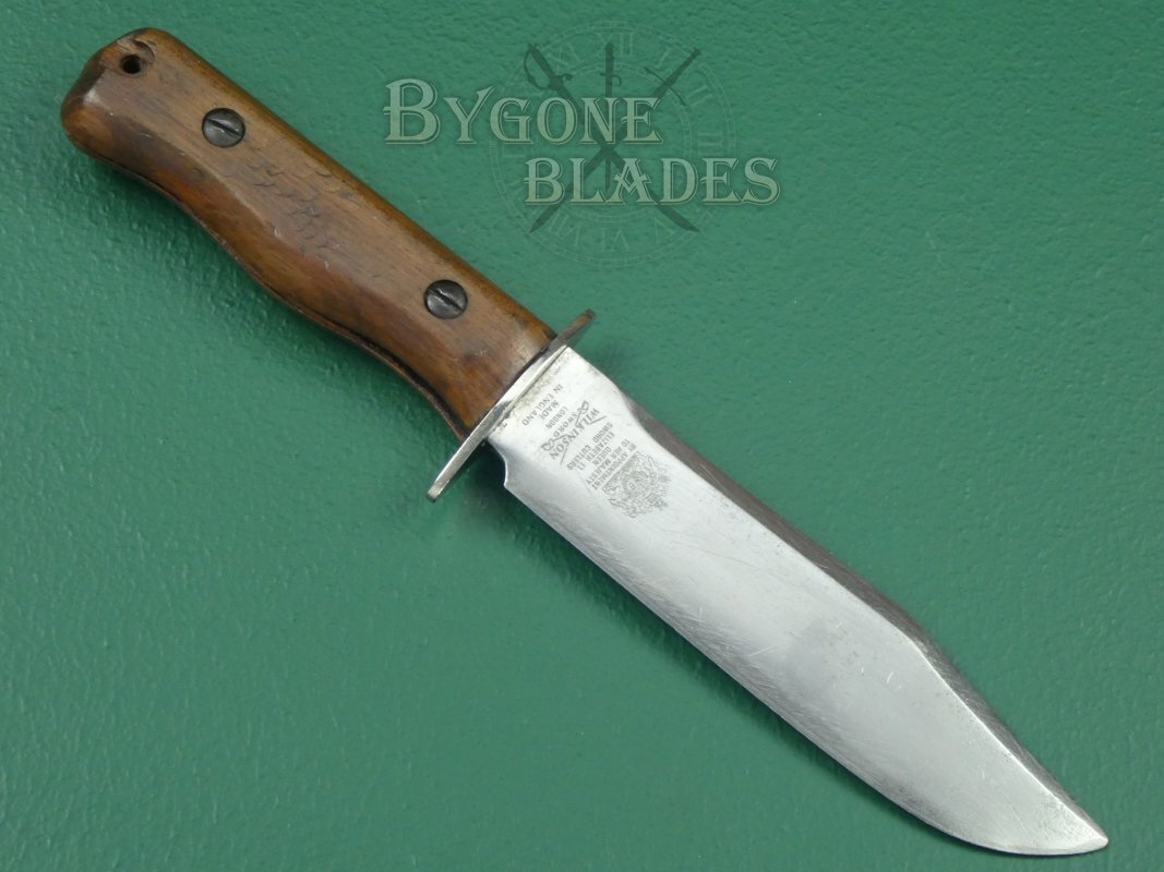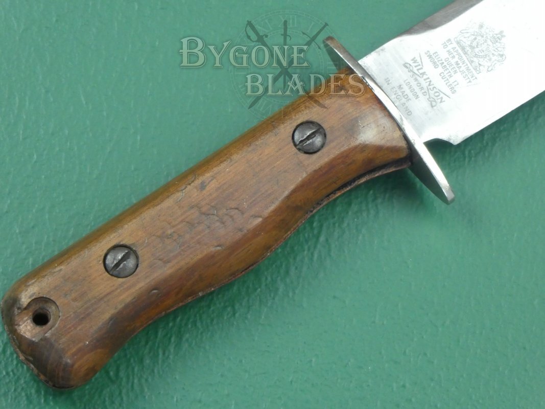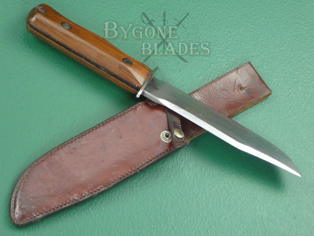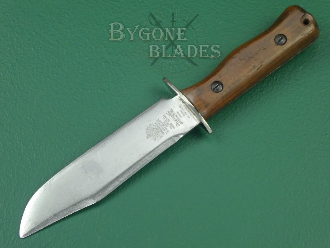 This is a great and honest example of a rare, mid-20th Century British Military private purchase combat/survival knife made by the Wilkinson Sword Company.