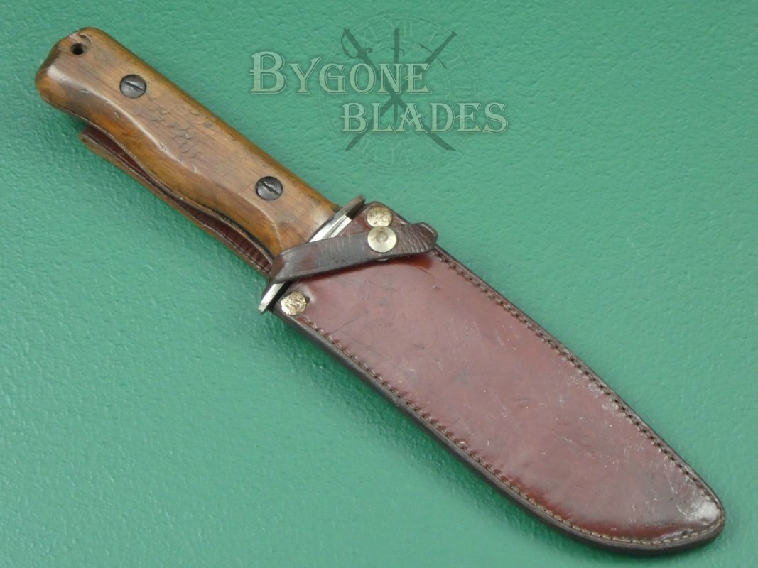 This early Wilkinson survival/combat knife is complete with its original leather scabbard. The scabbard is in good condition. The press-stud clasp on the retaining loop is in good working order.