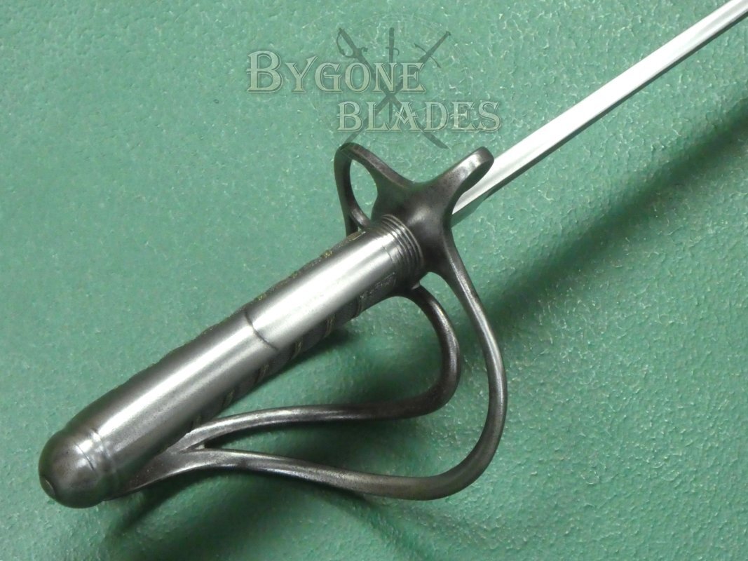 The sword is complete with its black leather scabbard with polished steel mounts. The bottom mount has some cleaned pitting. The leather is in good condition and retains its original finish with small losses. The stitched seam is intact and tight. The sword sheathes and draws smoothly and is held firmly within the scabbard.