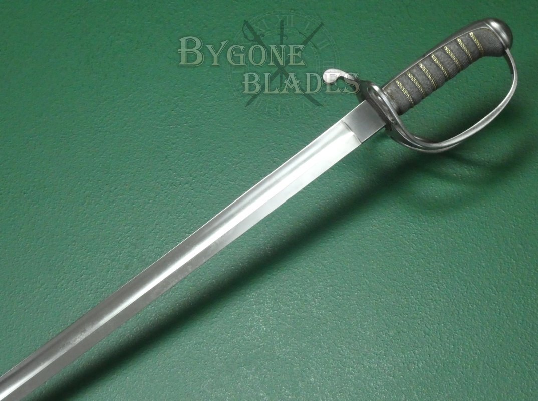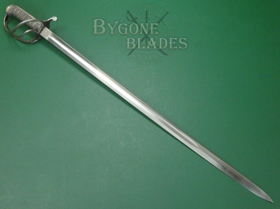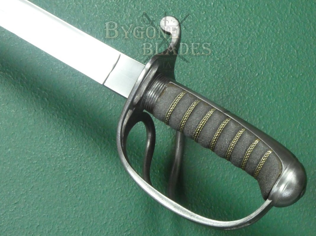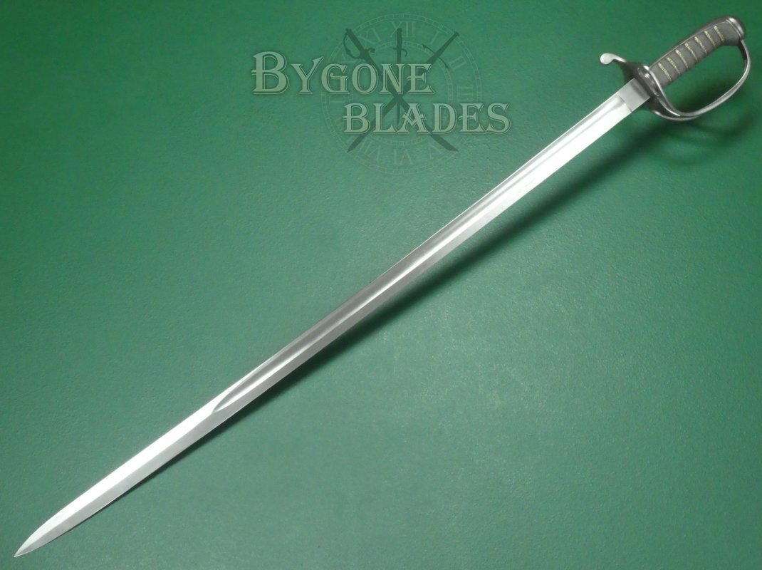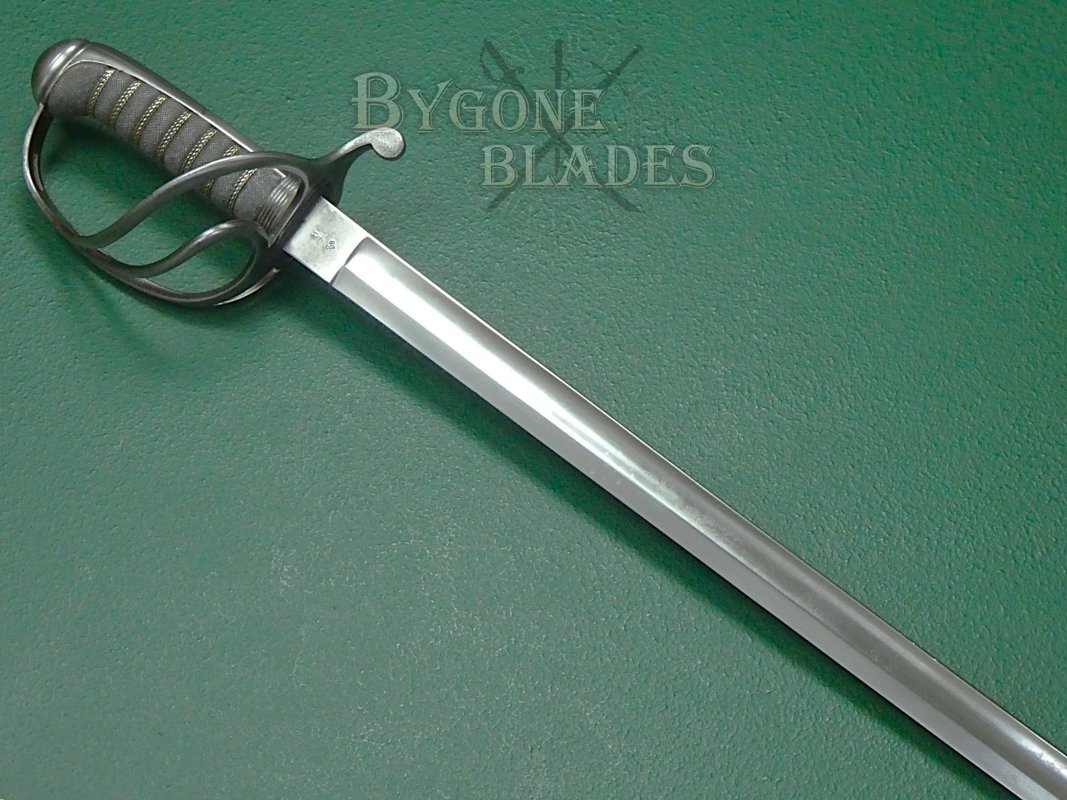 The 805mm single-edged blade is an almost straight version of the 1845 pattern “Wilkinson” blade. The blade has a flat spine above a deep single fuller and terminates in a double-edged spear point. The blade measures 30mm wide at the ricasso and has an 8mm thick spine.