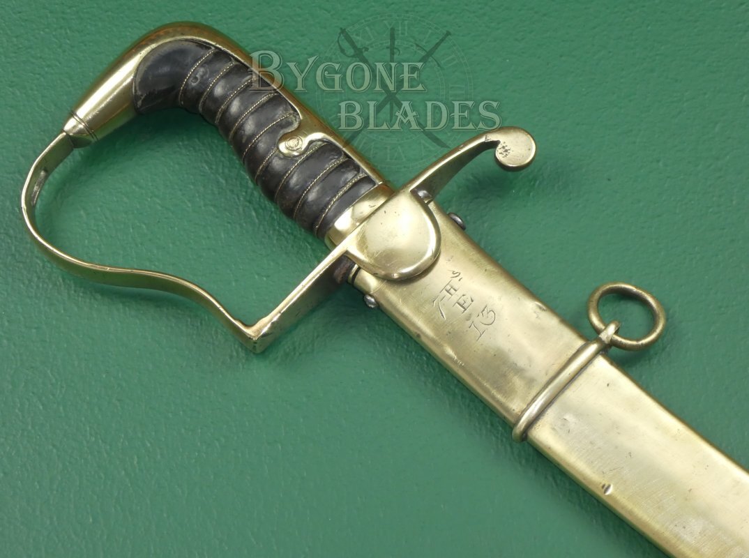 The 765mm curved blade has a broad single fuller below a flat spine and terminates in a narrow hatchet point. The blade is not quite as front heavy as a true 1796 patten blade but is otherwise very similar in profile. The blade is in very good condition with a service sharpened edge and only a few small contact nicks on the cutting edge and some defensive nicks the spine. The small defensive nicks on the spine are suggestive of combat use. The spine of the blade is stamped with the maker’s name, “I. Gill.”