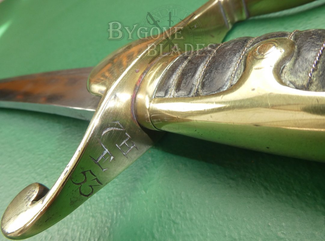 The brass hilt is of the 1796 pattern with an elongated, beaked pommel. The rear of the quillon is engraved with 7H over E 53. 7th Hussars, E troop, weapon number 53.