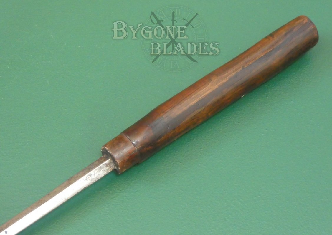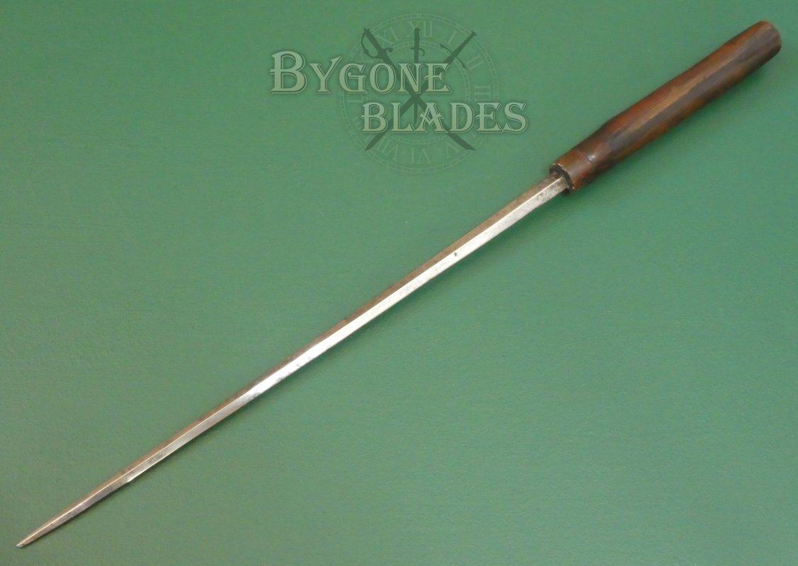 The 300mm double-edged bodkin blade has a flattened diamond cross section and tapers to a needle-sharp point. The blade is in good condition and has mild age related tarnish.