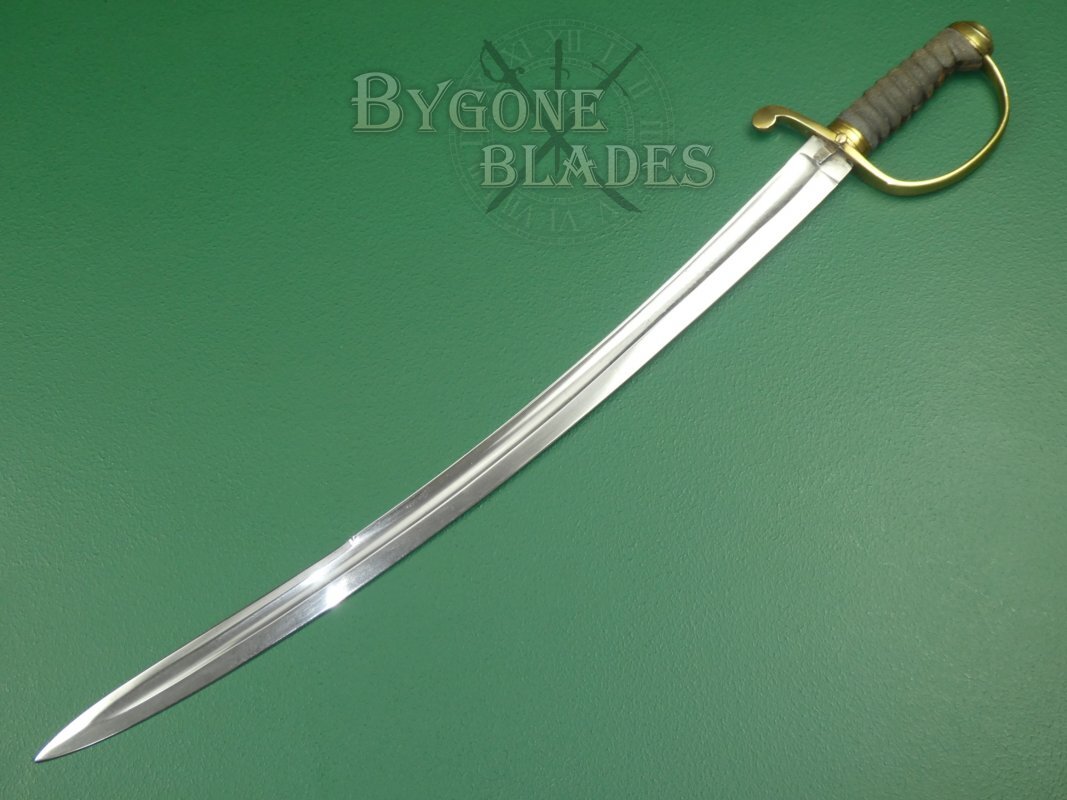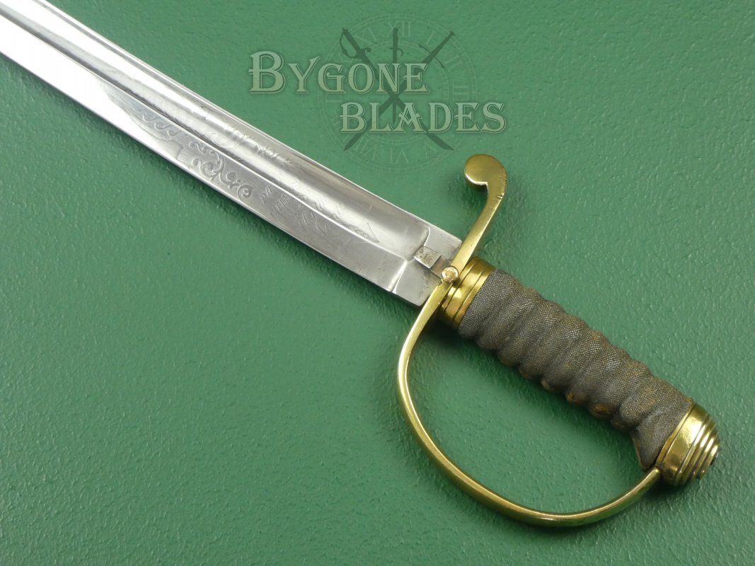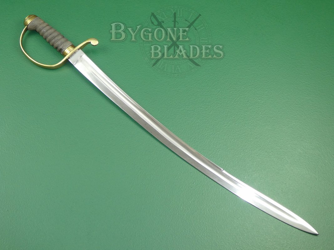 The brass guard has a “D” shaped knuckle bow with disk quillon and stepped oval pommel through which the tang is peened. The contoured wooden grip is wrapped with shagreen. The grip is in very good condition with minor age and use related wear. The blade is firm in the hilt.