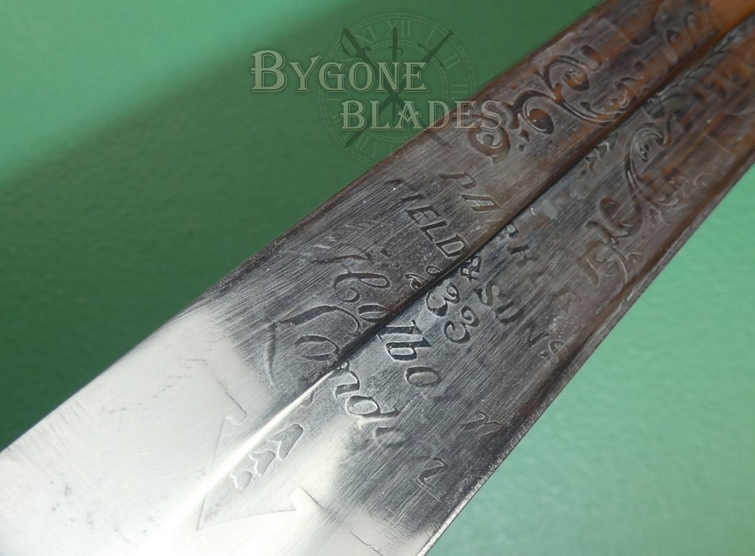 The 620mm broad, curved blade has a flat spine above a long single fuller on both sides. The fuller continues almost to the spear point. The blade is double-edged for the last 220mm. The forte is etched with the makers’ details, “Parker Field & Sons, 233 Holborn. London.” The blade is in excellent condition.