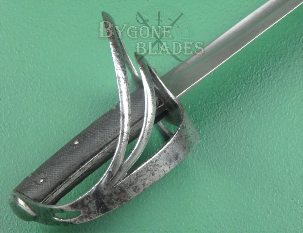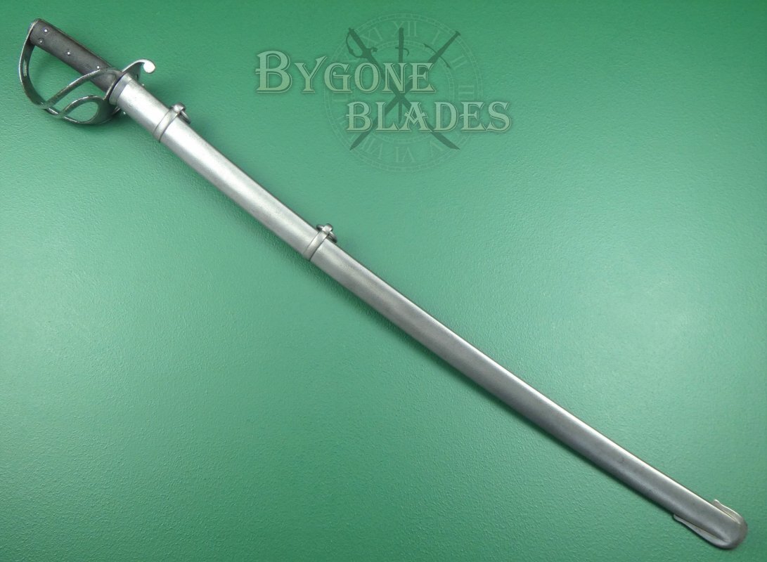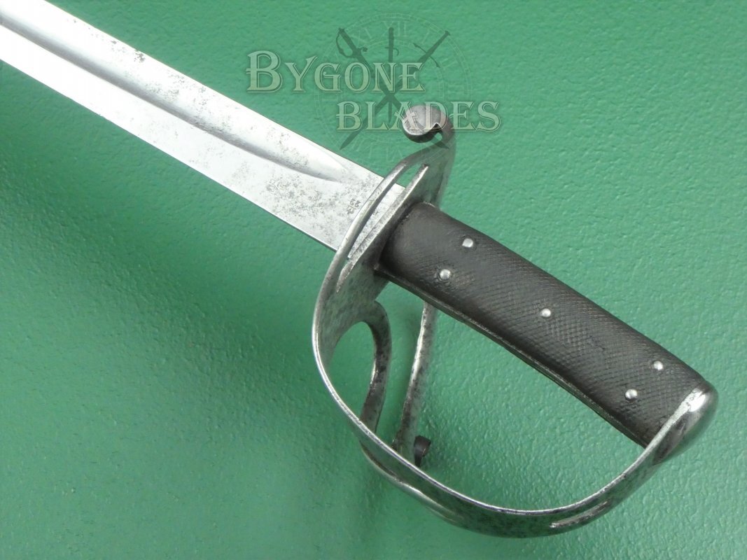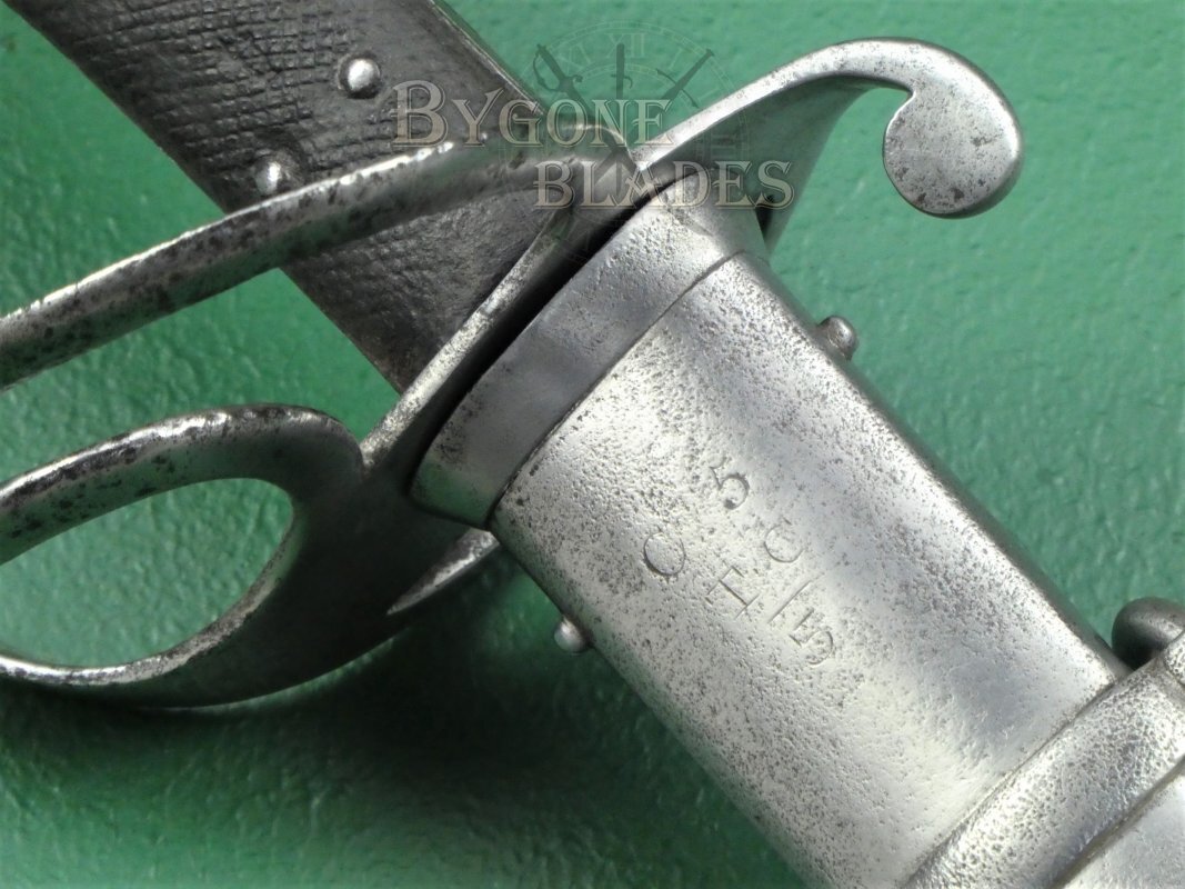 The sword is complete with its iron scabbard with twin suspension rings. The scabbard is in good condition with mild, shallow pitting and is free of dents and damage. The top of the scabbard, below the throat is engraved on one side with the regimental markings C 5, over T. C., over the weapon number 5. The sword sheathes and draws smoothly.