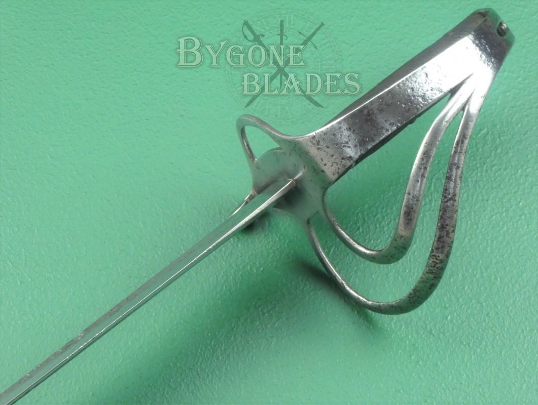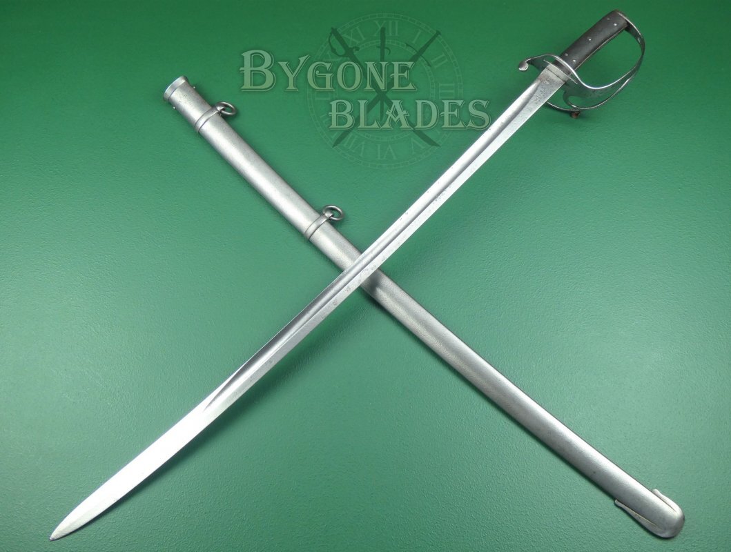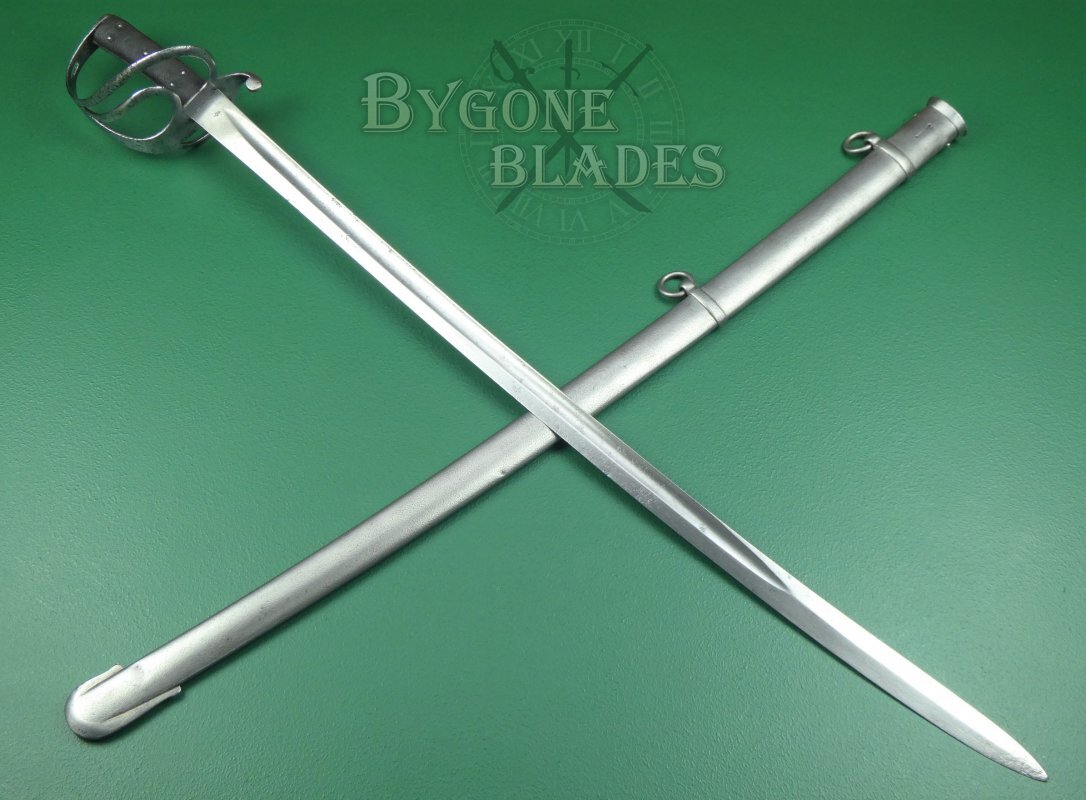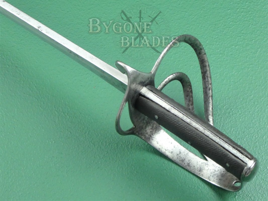 The sword is complete with its iron scabbard with twin suspension rings. The scabbard is in good condition with mild, shallow pitting and is free of dents and damage. The top of the scabbard, below the throat is engraved on one side with the regimental markings C 5, over T. C., over the weapon number 5. The sword sheathes and draws smoothly.