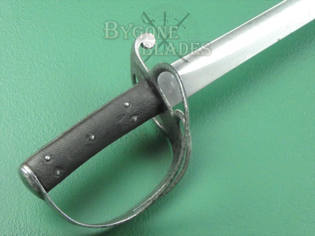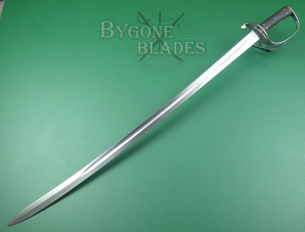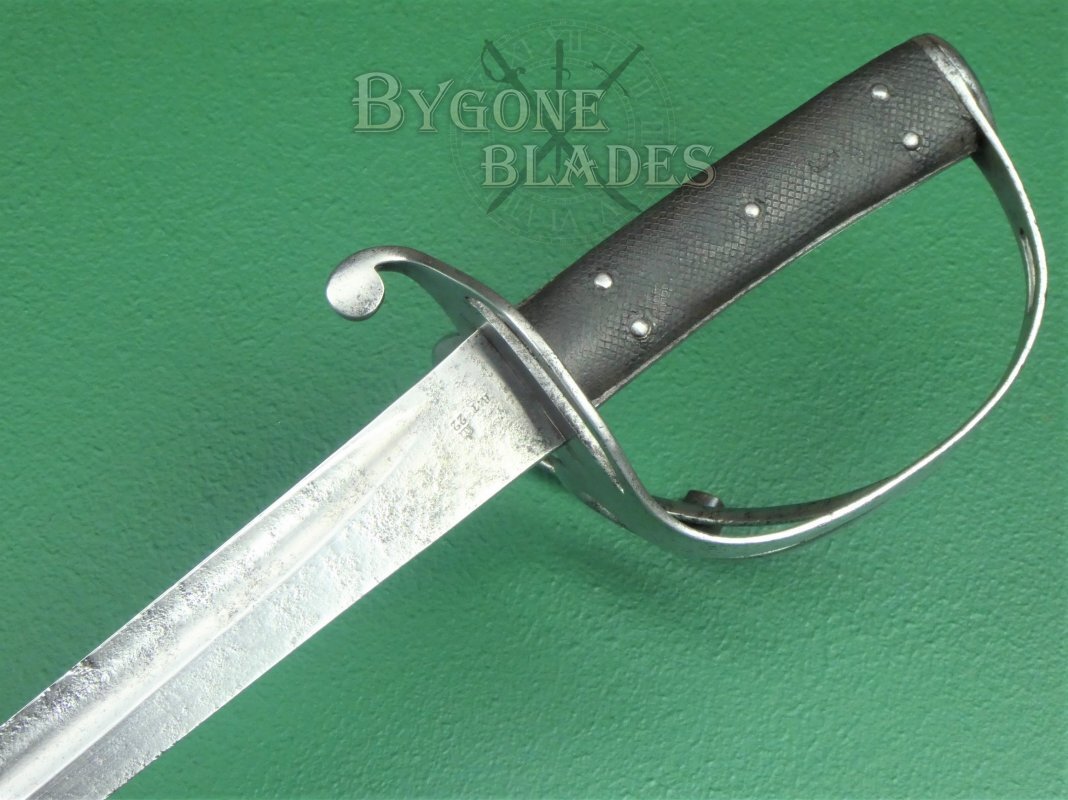 The 1853 pattern British cavalry sword was the first sword to be issued to troopers of both light and heavy cavalry regiments. The sabre was also issued to troopers of the Royal Horse Artillery. It was the first issued sword to utilise Reeves “Patent Solid Tang,” the blade and tang being of one piece instead of the iron “rat-tail” tang that was traditionally forge-welded on to the steel blade. This of course made for a much stronger sword, more rigid and far less likely to suffer a catastrophic failure having eliminated the junction between blade and tang.