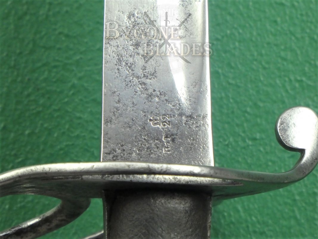 The spine bears a letter B, indicating the point of balance and the ricasso is stamped with a worn Solingen maker’s mark, T&C in an oval of dots, and a Birmingham inspection/reissue stamp. The obverse ricasso bears a crowned inspection stamp besides the initials, R.T. In order to increase production and equip departing troops with the new pattern sword, a number of Solingen based makers were awarded contracts to produce the P1853 at the onset of the Crimean War.