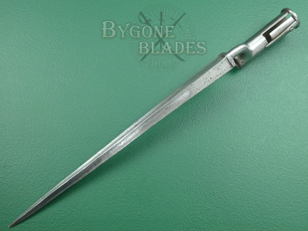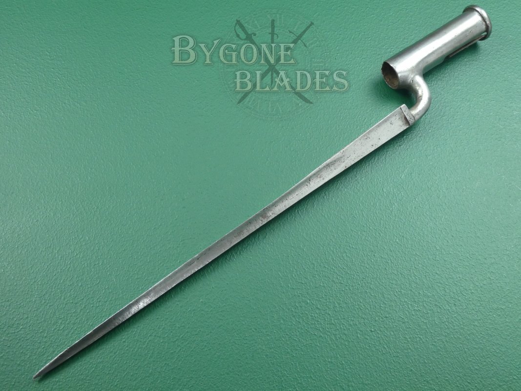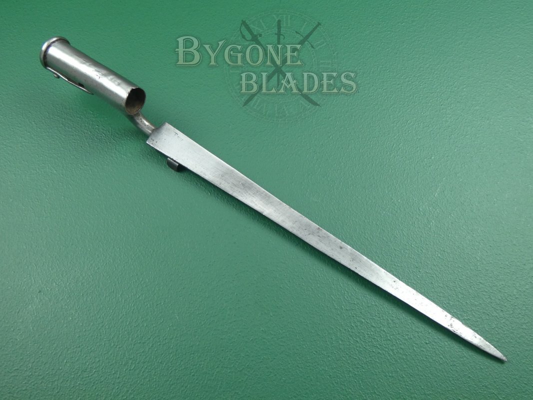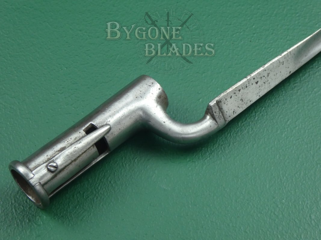 This bayonet is in very good condition and is bright and free of rust. Repeated polishing during the course of its working life (and since) have worn away any markings. The socket and blade have age and use related wear and dings.