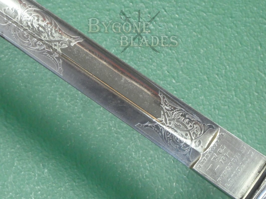 The spine bears the serial/order number 105066 and the ricasso bears a Pillin proof disk. The obverse of the ricasso bears the cutlers details, H. Maxwell & Co., 161 Picadilly, London. Henry Maxwell traded from these premises from 1850-1907.