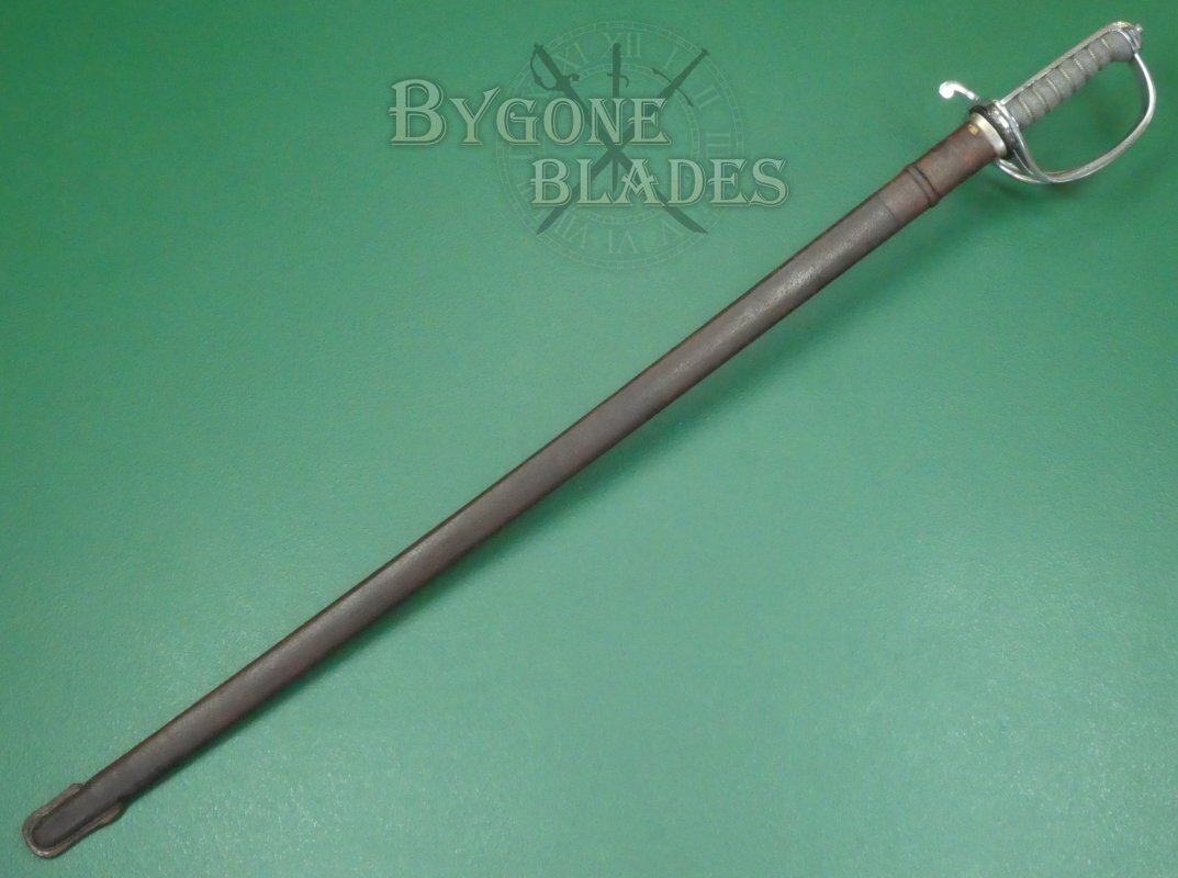 The 1901 pattern brown leather covered scabbard is in good condition but lacks its frog strap. There are age and use related scuffs and marks. The sword sheaths and draws smoothly and is held firmly in the scabbard.